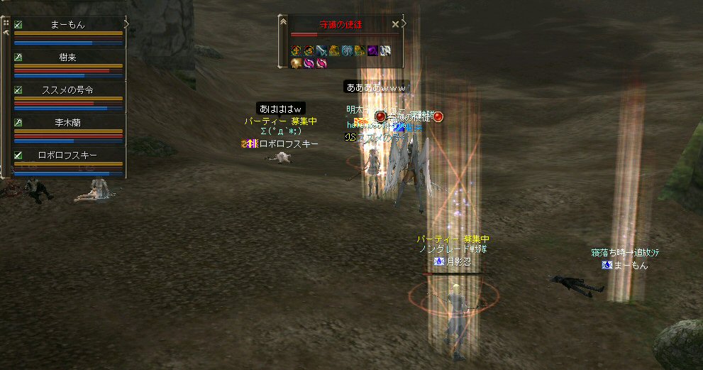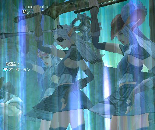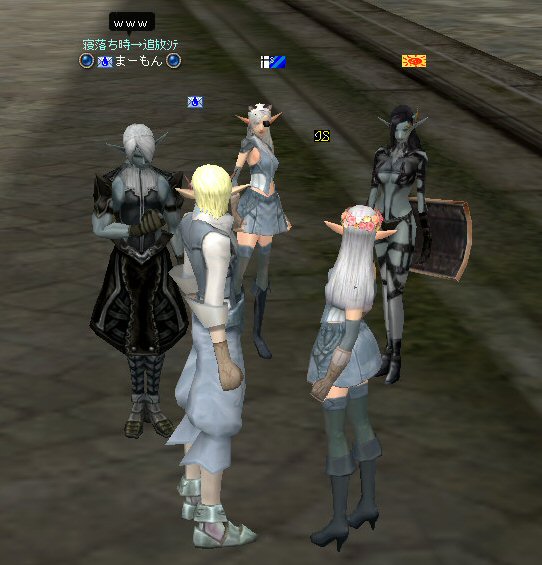 ここで新たにアンポンタンさんが参戦 火力アップだw ここも、いけるぞw(危ないけど) 近接戦闘は、範囲スタンとか敵から受けると不利になる。 特に装備なしだと、ダイレクトにダメージを受ける。 ちょいと叩かれただけで、HPが半分飛んでいく世界だ。 今回はヒーラー職から「ヒールは期待しないでねw」と言われるくらい厳しい状態だ。 HPが減ったの見てから詠唱したのでは『間に合わない』のだ。 そういう意味では先を読んで、魔法の詠唱をする必要がある。 俺もヒールを期待してはいない。 HP回復剤を使って回復し、ヒールは補助的にかかる位の気持ちでやら無いと危ないのだ。 タゲられて、ダメージを受け始めたら即その場から離れるようにしないとすぐにHPは無くなる。 それがクリティカルダメージなら、即死だ。 ススメの号令さんもまーもんさんも逝ったw ヒーラーのヒールに反応して、タゲがヒーラーに移る事もある。 必至にタゲを奪い返そうとモンスターを攻撃するが、間に合わない事もある・・・ 李木蘭さんもシレノスで一回逝った;w; いずれにしても協力無しに、強力なモンスターに勝つことは出来ない。 PT内での連携が面白さのひとつでもある。 ↑まーもん氏、復活の図 ↓美女たちの帰還 今回の、事の始まりはと言えば、 エルフ姉妹達の装備交換から始まったと言ってもいいだろう。 同じ種族が並ぶと、それなりに画になる^^ 今回は、過激だった>w< 参加したみなさんお疲れ様でした^^w ノングレードで行こう!『ゴダード裸族作戦終了』