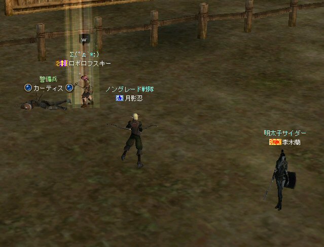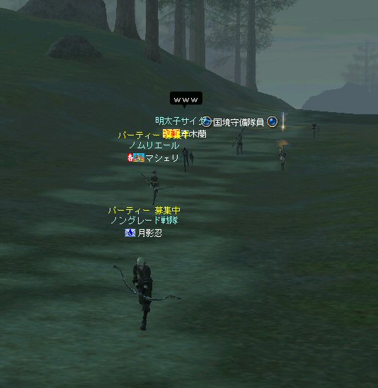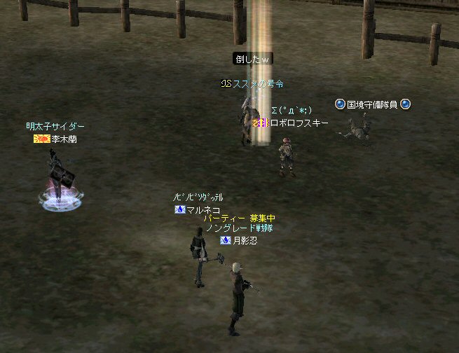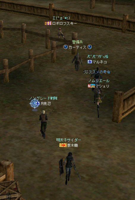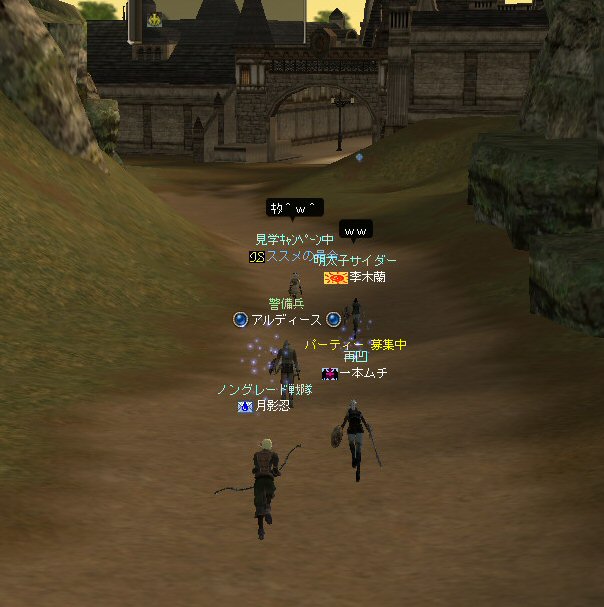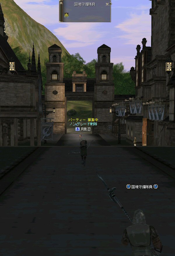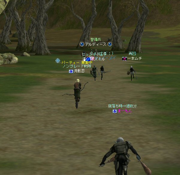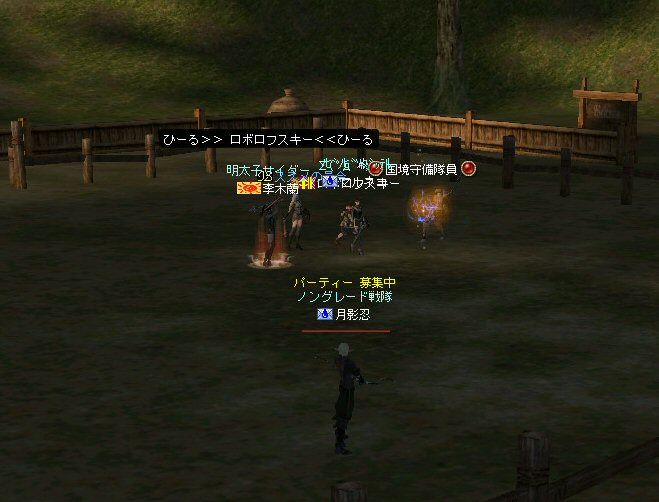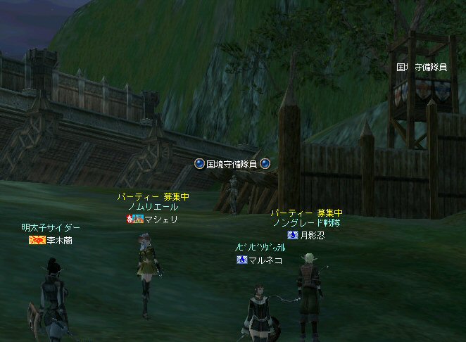 以前は21:00集合としていた集合時間も…今は21:30。 30分遅くしたにも関わらず、集まりが悪い(と言うか変わらない?)。 おまけに21:00前後はレイドイベント真っ盛りだ。 俺のスレよりも後のスレの方が 人々の関心の深さの表れかもしれない。 (たくさん来てもらっても収拾がつかないけどな^^;) 関心の深さ云々はともかく、 いったい、何時に集合するのがベストなのだろう? あまり開始時間を遅くしてしまうと、終わる時間が遅くなる。 遅くなると(参加者の)次の日の仕事に差し支えるからな…。 遅くとも12:00頃には終わらせたい。 東京都内なら通勤2時間と考えると、18時に仕事が終わったとして帰宅は20時。 (まあ、大都市周辺なら同じ様なものだろう) 順調に行けば、食事してお風呂に入って21時にINという所か。 残業が入ると、やはり厳しいな^^; 一応、22:20頃まで待って見た。 このままだと、ノングレを行う時間がなくなってしまうw 集まったメンバーで現地へ移動。 ちなみにマシェリさんは初参加。 ここは、要塞戦の舞台でもある。 要塞戦の仕様が導入され、初めて来る場所なので、 国境守備隊員(NPC)の仕様が変わっていると引きができなくなる可能性もある。 って言うか、国境守備隊員、居るのか? ちょっと心配だったのだが、いたいた。 要塞戦で、傭兵にとって換わられてたりしたらどうしようかと思っていた。 どうやら、首にはなっていなかったようだ。 いったん攻撃して反応も同じか試してみる。 普通に攻撃しようとしても仕様上、 出来ないので、強制攻撃( /forceatk )のマクロを作って攻撃。 一発、二発、三発・・・外れる@w@; お、当たった、 うまく引けそうだ。 で、いったんみんなで国境守備隊員を倒し、仕切りなおし。 さ、国境守備隊員をギランまで護衛しよう。 ギランのお母さんに会わせてあげようじゃないかw ギランへ向けて『国境守備隊員の護送作戦』開始w 今回の作戦の場合、弓職が複数いるのはとても都合がいい。 お互いに連携して、タゲが外れてもフォローができる。 おまけに接近せずに攻撃できるのでフットワークが軽い。 遠距離攻撃でヘイトを稼いで、タゲを取り続けることが出来るからだ。 オーレンの城村の横を通り過ぎ、南下を続ける。 ロボロフスキーさん、うどん総理さんと合流、 途中、SS(スクリーンショット)を撮りながらなので、守備隊員に叩かれる。 それをヒールする蘭さんにタゲが奪われがちだ。 アタッカーよりも婦女子を追い掛け回す守備隊員。 綱紀が乱れているなw 『俺の蘭さんに手を出すなwww』 怒りのダブルショットw アタッカーがタゲを何とか保持しつつギランへ ギランの街中を引いて見る。 知っている人は知っている、国境守備隊員の勇姿だ。 国境守備隊員君、お母さんには会えたかな? さ、せっかくギランの決闘場まで来たのだから、歓迎会だw 盛大なパーティで国境守備隊員は、酔いつぶれてしまった。 都会の酒が美味かったのか、そのまま天国へ・・・^^; せっかくなので、ギラン常駐の警備兵、カーティス氏も呼んで見ようw 国境守備隊員君は、ゴダードの国境付近から、ずーっと走ってきて、 アルコールの回りが速かったのだろう・・・ 駆けつけ三杯で逝った。 君はギランからすぐのこの場所で、もう逝くのかwww そか、君は下戸だったんだね。 知らなかった・・・。 一杯で、潰れちゃったよ =w=; などと冗談は置いといて、今日も楽しめた。 かなりの距離を引く事が出来た。 今度やるときは、さらに遠くまで引いてみたい。 協力してくれた皆さん、ありがとうございました^^ノ またね^^