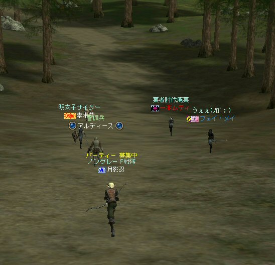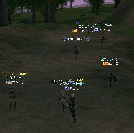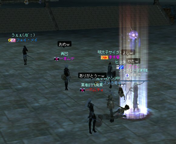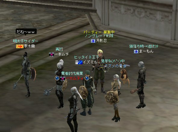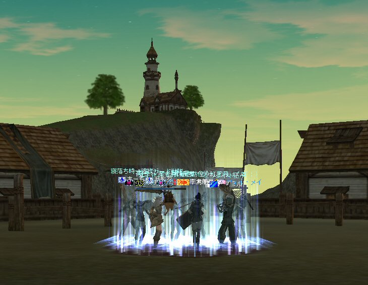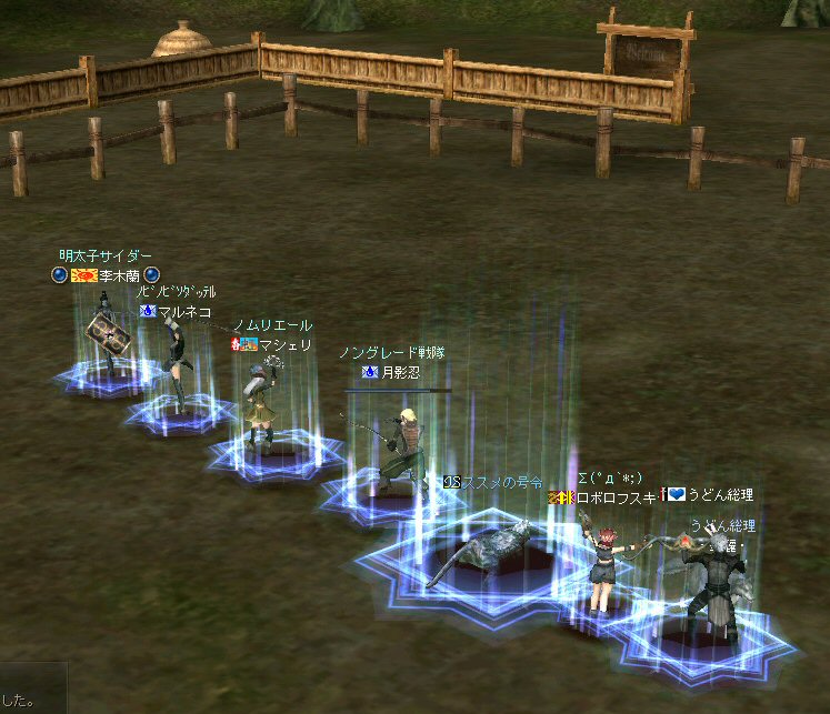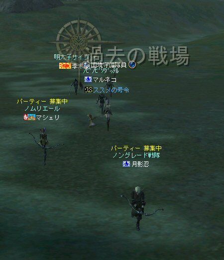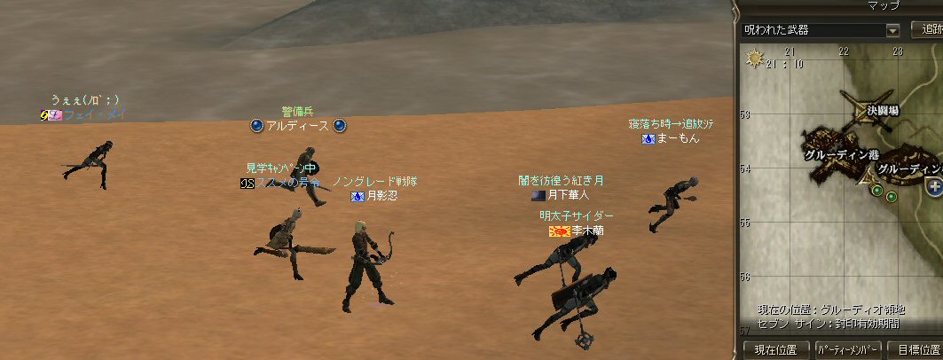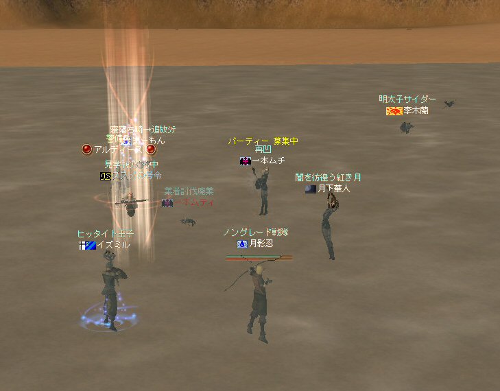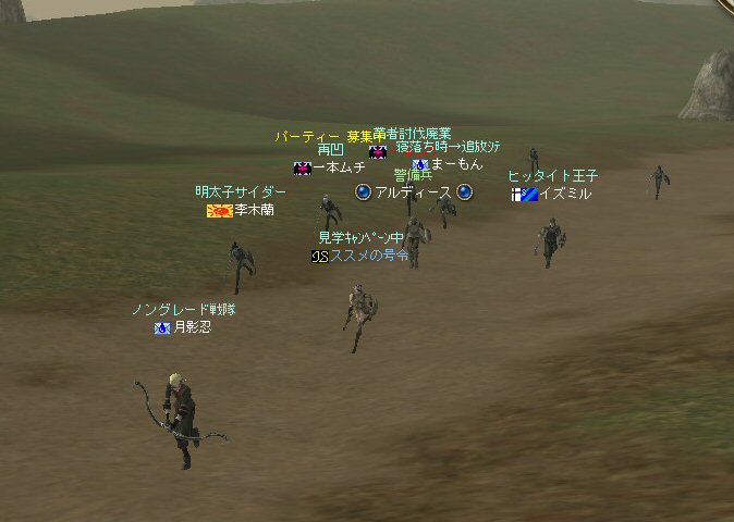 以前は21:00集合としていた集合時間も…今は21:30。 30分遅くしたにも関わらず、集まりが悪い(と言うか変わらない?)。 おまけに21:00前後はレイドイベント真っ盛りだ。 俺のスレよりも後のスレの方が 人々の関心の深さの表れかもしれない。 (たくさん来てもらっても収拾がつかないけどな^^;) 関心の深さ云々はともかく、 いったい、何時に集合するのがベストなのだろう? あまり開始時間を遅くしてしまうと、終わる時間が遅くなる。 遅くなると(参加者の)次の日の仕事に差し支えるからな…。 遅くとも12:00頃には終わらせたい。 東京都内なら通勤2時間と考えると、18時に仕事が終わったとして帰宅は20時。 (まあ、大都市周辺なら同じ様なものだろう) 順調に行けば、食事してお風呂に入って21時にINという所か。 残業が入ると、やはり厳しいな^^; 一応、22:20頃まで待って見た。 このままだと、ノングレを行う時間がなくなってしまうw 集まったメンバーで現地へ移動。 ちなみにマシェリさんは初参加。 ここは、要塞戦の舞台でもある。 要塞戦の仕様が導入され、初めて来る場所なので、 国境守備隊員(NPC)の仕様が変わっていると引きができなくなる可能性もある。 って言うか、国境守備隊員、居るのか? ちょっと心配だったのだが、いたいた。 要塞戦で、傭兵にとって換わられてたりしたらどうしようかと思っていた。 どうやら、首にはなっていなかったようだ。 いったん攻撃して反応も同じか試してみる。 普通に攻撃しようとしても仕様上、 出来ないので、強制攻撃( /forceatk )のマクロを作って攻撃。 一発、二発、三発・・・外れる@w@; お、当たった、 うまく引けそうだ。 で、いったんみんなで国境守備隊員を倒し、仕切りなおし。 さ、国境守備隊員をギランまで護衛しよう。 ギランのお母さんに会わせてあげようじゃないかw ギランへ向けて『国境守備隊員の護送作戦』開始w 今回の作戦の場合、弓職が複数いるのはとても都合がいい。 お互いに連携して、タゲが外れてもフォローができる。 おまけに接近せずに攻撃できるのでフットワークが軽い。 遠距離攻撃でヘイトを稼いで、タゲを取り続けることが出来るからだ。 オーレンの城村の横を通り過ぎ、南下を続ける。 ロボロフスキーさん、うどん総理さんと合流、 途中、SS(スクリーンショット)を撮りながらなので、守備隊員に叩かれる。 それをヒールする蘭さんにタゲが奪われがちだ。 アタッカーよりも婦女子を追い掛け回す守備隊員。 綱紀が乱れているなw 『俺の蘭さんに手を出すなwww』 怒りのダブルショットw アタッカーがタゲを何とか保持しつつギランへ ギランの街中を引いて見る。 知っている人は知っている、国境守備隊員の勇姿だ。 国境守備隊員君、お母さんには会えたかな? さ、せっかくギランの決闘場まで来たのだから、歓迎会だw 盛大なパーティで国境守備隊員は、酔いつぶれてしまった。 都会の酒が美味かったのか、そのまま天国へ・・・^^; せっかくなので、ギラン常駐の警備兵、カーティス氏も呼んで見ようw 国境守備隊員君は、ゴダードの国境付近から、ずーっと走ってきて、 アルコールの回りが速かったのだろう・・・ 駆けつけ三杯で逝った。 君はギランからすぐのこの場所で、もう逝くのかwww そか、君は下戸だったんだね。 知らなかった・・・。 一杯で、潰れちゃったよ =w=; などと冗談は置いといて、今日も楽しめた。 かなりの距離を引く事が出来た。 今度やるときは、さらに遠くまで引いてみたい。 協力してくれた皆さん、ありがとうございました^^ノ またね^^