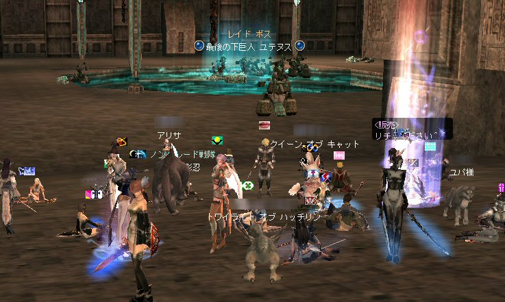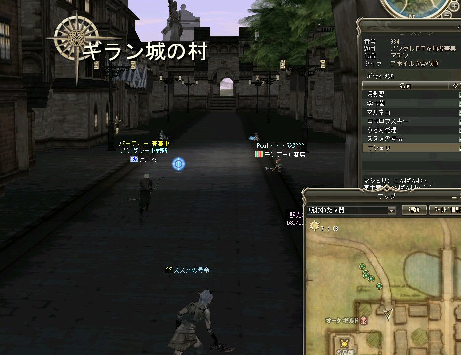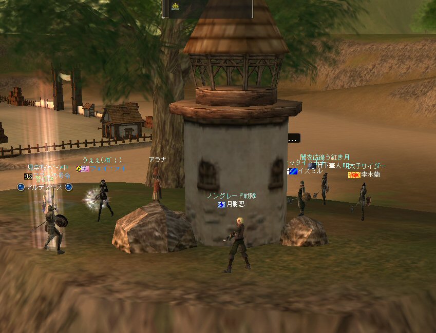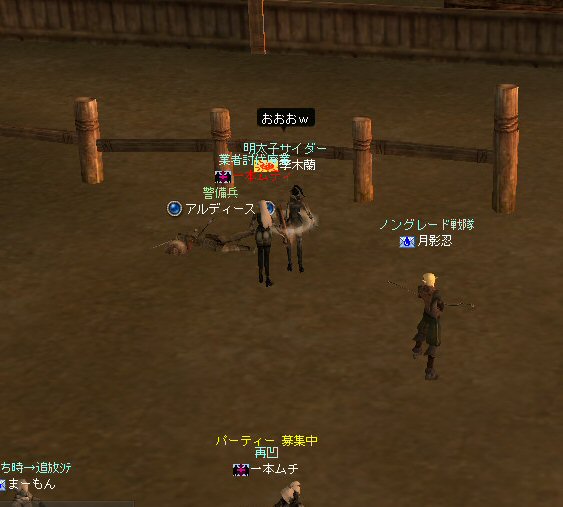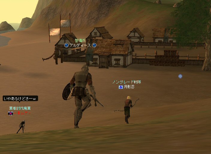 アデンは山の中だ。 たまの休暇と言ってもアデンの街中をぶらつくのが日常。 ハイキングに行くのもいい。 大自然の山々、咲き誇る草花、聳え立つ木々、 そして・・・その建造に至る真意が伝わる事無く、 事切れてしまった文明の跡、古代遺跡の数々。。。 モンスターが各地に棲みついているのは難点だが、 観光スポットには事欠かない。 しかし、海は遠い・・・。 そんなぼやきをアデンの酒場で聞いた。 退屈しているアデン城常駐の警備兵に、 日常からちょっとだけ外れた冒険を、 我らノングレード戦隊が提供してあげよう。 イベント真っ盛りの時期だと言うのに人が集まった。 今回は何とノングレ史上初のアカネキャラが参加だw ゲームの仕様上、無差別PKだろうが業者やBOT討伐だろうが、 白ネームのキャラクターを倒せば、倒したキャラの名前は赤くなる。 赤ネームには赤ネームの事情があるのだ。 我が『ノングレード戦隊』では、悪意のあるPK(無差別PKとか)以外なら、 もちろん参加可能だ。 ただし、赤ネキャラの場合、いつもとは違った要素が追加される。 白ネの時は、見守るだけの警備兵が攻撃してくるようになる。 つまり、アデン城村から出るときに攻撃されるw また、今まで気楽に村を通過していたが、そのたびに攻撃を受ける事になる。 当初、グルーディンの海の見える丘へ向かうにあたり、 宣伝をかねて猟師村とか通過を考えていたのだが・・・ それでは赤ネ参加の一本ムティさんの命が危ないw で、先週と同じ、傲慢を横切るオーレンコースとした。 対象の警備兵はアデン西門を警備している「アルディース」氏と決定。 アデンを出る際に、弓の警備兵を倒してからアルディース氏を連れ出そうとしたが、 弓の攻撃力が高すぎて、断念>w<; 何人か攻撃を仕掛けて見たが、皆一様にHPが半分以上持っていかれた。 今回、死亡者は出なかったが、クリティカルが出たら即死だ。 しかし、そうやって他の参加者がタゲを取ったおかげで、 ムティさんに向かうはずの弓警備兵のタゲが外れた。 そのまま城外に飛び出し、移動開始。 途中、ムティさんや、まーもんさんが落ちて、置き去り状態に。 まあ、ゆっくり進行してるし、途中時間稼ぎもしているので追いつけるだろう。 ヒーラーに矛先を向ける警備兵をなだめながら移動。 タゲ取りしながらのリレーは、結構たのしい。 今回は長丁場なので、補助魔法も途中で切れる。 タゲが他の人に移ったら自分に補助魔法かけ、他の人も同様に役割を交代しつつ移動を続ける。 ギラン領土へ。 なおも南下を続ける。 急に重くなる。アクティブモンスターもいる。 今となっては真っ青な敵だが、油断は出来ない。 いくら高レベルでも、ノングレード装備なのだ。 当然、アクティブモンスターも倒す。 ギラン村へ行くT字路で、俺が落ちたw クリエラは仕様か!? 復帰してみると、側には誰も居ないw T字路で西へ進路を変更、ダッシュで追いかけるw いたいた。 無事合流を果たし、グルーディンを目指す。 グルーディオ城村も通過。 新しく出来た要塞もちょっと見学しつつ(単なる道草w) 道草中に通常攻撃をしてしまったw クエストは普通に表示される。 こんな場所に来てもアルディース警備兵は仕事をしていたw グルーディンの村へ。 もうすぐゴールだ。 しかし、アカネのムティさんが居る事を忘れてはいけない。 村を通過しようとすれば攻撃を受ける。 さて、どうする? (つづく)