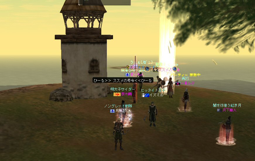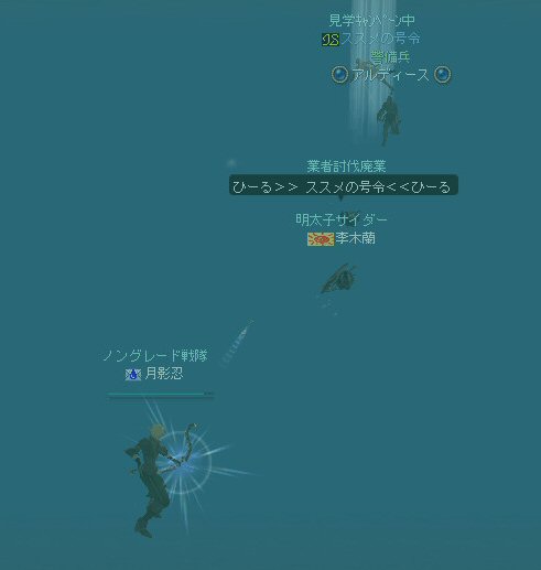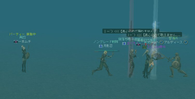 山を越え、海岸へ そして、最終目的地はここだ。 転職クエだったと思うが、ここを訪れた人も居る事だろう。 夕日を受けて聳え立つ灯台の元、歓喜に震えるアルディース君としばし戯れる。 アルディース:海だ~>w<ノ ミッション『海が見たい作戦』コンプリート さて、 アルディース君をTI(話せる島)へ連れて行けないだろうか? それは新たなミッションとして開始された。 多分、リネ史上、アデンの警備兵をTIまで連れて行った人間はいないだろう。 ここまで来たら、試すしかあるまいw といっているうちに、みんな飛び込んでいるw さすがノングレード戦隊! そして我々は、この試みの中から新たな発見をした。 アルディース君は、山育ち。 近くに湖はあるんだが、恐らくは行った事が無いのだろう。 泳げないのだ。 我々が、いくら泳いで見せても彼は泳ぎが理解できないらしい。 リネの物理法則を無視した移動方法は、たまに見かけるのだが・・・ 彼の場合、水中を走るw ちょーwww すすめの号令さんが、泳ぎを教えようと、必至にやり方を見せてはいるんだが、 泳ぐより走る方が速いらしい。 事実、あっという間にススメさんに追いつく。 そして、 ススメさんの遅さに怒りをあらわにしたアルディース君が、八つ当たりでススメさんを殴るw これはマズイ。 みんなで集まって、水中会議をしているんだが、 どうもアルディース君の気持ちが収まらないらしい。 このまま、ここで会議をしていると溺れてしまう。 地上に移動しよう… おお、喫茶『決闘場』だ。 ここの酒はうまい。 ダブルショットがお勧めだ。 他にもスタンショットやモータルブローなどもあっただろうか。 女性エルダーからマナバーンとトランスを交互に振舞われると、弓職の俺などヘロヘロだ。 おっと、強い酒を一気飲みは体に良くないぞアルディース君。 ありゃ、つぶれてしまったw 主役がつぶれてしまっては、パーティもお開きだな。 アデンからの長期走行旅行、みんなお疲れ^^ さ、家に帰ろう… めでたし、めでたし …? と言う事で、本日のミッションは全て終了した。 参加した皆さん、お疲れ様でした^^; おまけ。 一本ムティさんが、グルーディン村に入るにあたり、 赤ネキャラ専用の、ストーカー行為常習警備兵に追われていたので倒してみた。 以前は怖くて攻撃も出来なかった警備兵… 最近普通に倒してるよね… ^ー^;