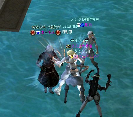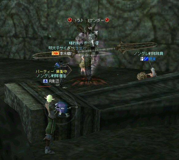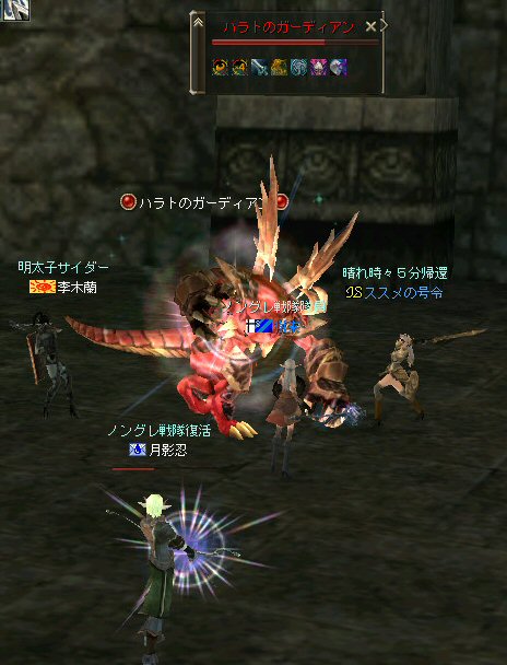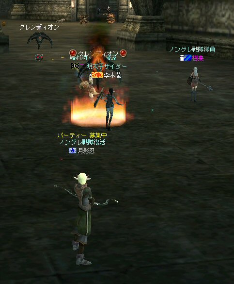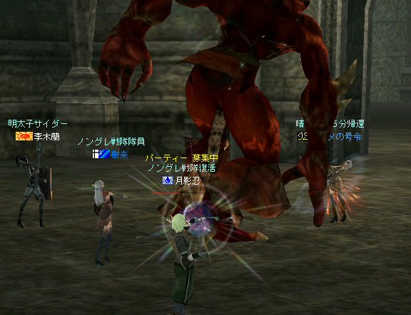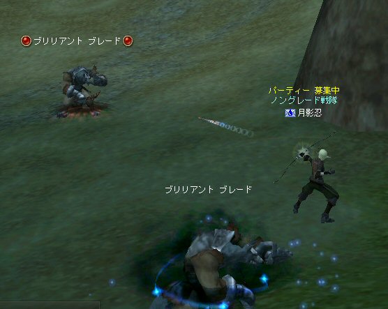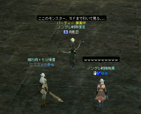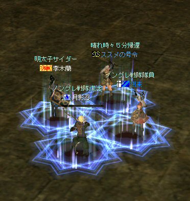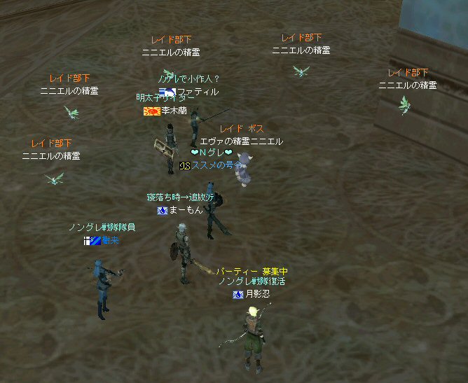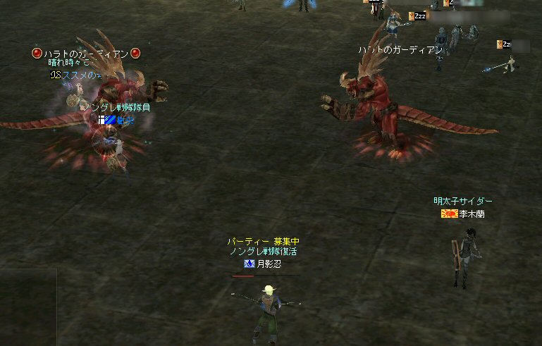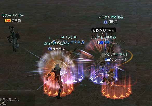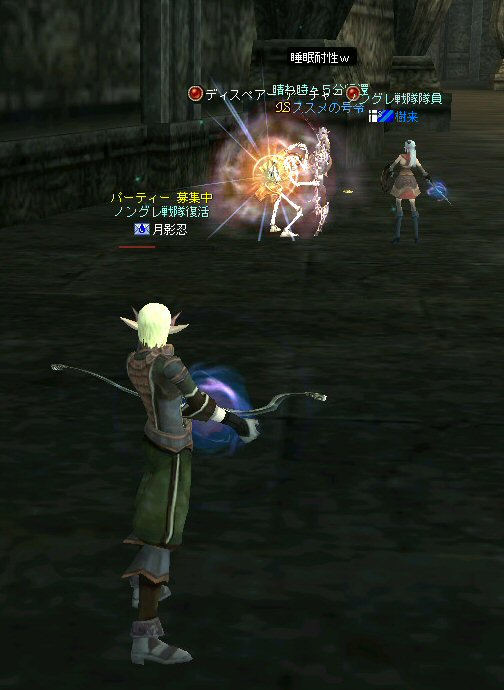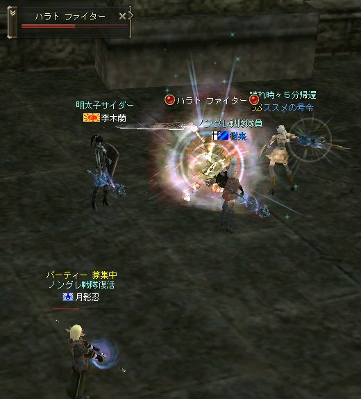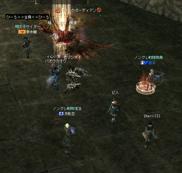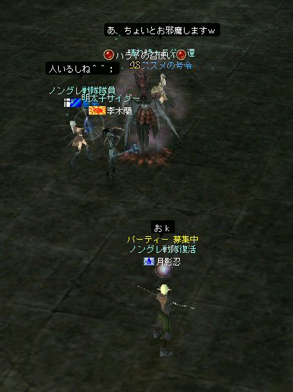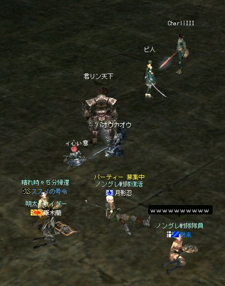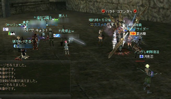 戦闘を開始したノングレード戦隊。 ところが俺のNSSが切れた。 弓職の火力はかなり高い。 PTの参加人数的に考えれば、主火力と考えていい。 その火力が半減したw 危機的状況である。 しかし案ずる事は無い! こんな事もあろうかと圧縮パックを持ち歩いているのだ。 一袋1000発入ってる。 ・・・え? 解凍できない!? またまたピーンチ!! スロット的にはまだ、空きがあるんだが、空きが無いと認識されている。 (80%問題か、はたまたバグか?) いずれにしてもここは押し切るしかない。 気持ちはあせるが、行動が伴わない…。 (今まで使った事が無いプレイヤースキルだw) … … … この回、ほとんど戦闘に参加していなかったので、 ススメさんとヒーラー(李木蘭さんと樹来さん)で倒したw 俺、何やってんだろう^^; さて、気を取り直してペットに荷物を退避。 圧縮NSSを3袋ほど解凍した。 今日は、ペットに頼りたくないので、BMウルフはしまうw 戦闘再開。 しばしノングレ戦闘を楽しんでいると、変なものがわいたw 怪しげな名前。 恐らくはBOTだろう。 出現したものの、時々補助魔法かけたりしているが、狩場へ動く気配が無い。 邪魔だw 俺たちここで狩してるんだけどな… ま、いっかw せっかくなので、彼らのそばで狩りをする事にした。 モンスターの範囲攻撃とかの巻き添えを食わせて楽しませてもらった。 そう、彼らがのんびり座って居られない状況を作ってあげた ^^v しばし、BOTで遊んでいると(すでに目的が違ってるw)、 また、集団のプレイヤーが、俺たちを観戦に来た。 (PM:多分普通の狩りをしにきた普通のPTです^^;) 彼らから教えてもらったんだが、 ここのBOTERは日本の不正プレイヤーが所持しているらしい。 戦争期間中は、BOTが居なくなるそうだ。 BOTは…と言うよりは、 不正プレイヤー(あるいは業者w)はドビ鯖から出て行ってもらいたいものだ。 まあ、リネの仕様の問題もあると思うけどね… 不正プレイはいけない。 ま、何にせよ、 久々の傲慢。楽しませてもらった^^v 参加メンバーのみなさん。お疲れ様でした^^ノ