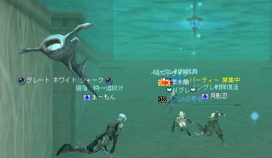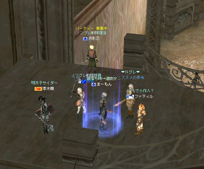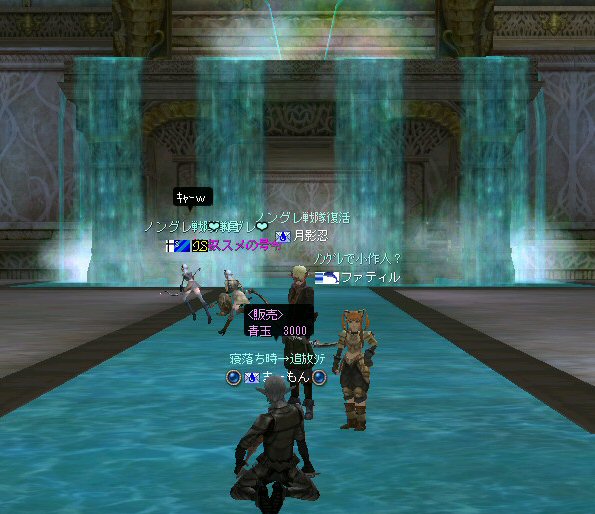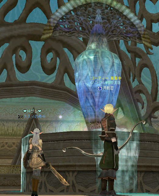 「この中に、宇宙人、異世界人、未来人、超能力者がいたら、ノングレード装備で来なさい!!」 この命令に従って集まるキャラクターがいるとしたら、 恐らくは『涼宮ハルヒ』の名前を知っているに違いない。 しかし、集まったのはノングレード戦隊のみだった・・・。 しかもゴールデンメンバーだw はてさて、今回はどのような場所に行こうか・・・。 「ノングレードで行こう!」と言うサークル活動を続けていく上で、いつも悩みどこにろである。 そんな時、GyAo Animation で「[B-ch]涼宮ハルヒの憂鬱」を見た。 http://www.gyao.jp/anime/ いや、おもしろい。 と言うか「あーもー、なんか面白い事無いかな~」って感じに共感した。 そう、リネージュ2も突き詰めていけば、 「狩り」「PVP」「戦争」「ボス討伐」「クエスト攻略」「ペット育成」「金儲け」「製作」「その他」 多分、あそびを分類するならこれくらい。 目的を分類すると、そりゃ人それぞれになるか・・・。 普通の遊び方もいいけど、同じ遊び方ばかりじゃ飽きる。 「つまんない、つまんない、つまんなーい!」 告知もいつもと同じような内容だと、書いている自分に対して、 「つまんない、つまんない、つまんなーい!」と頭の中で連呼する声が聞こえる。 (読んでるほうも、『またか』で終るw) そろそろネタ切れか@w@ (最初からノングレ以外のネタが無い・・・) で、告知文を変えたが・・・反応が無い。 ・・・って言うかビュー数が少ない;w; とりあえず集まったゴールデンメンバーで考えた。 俺「今日は、どこ行こうか?」 みんな「んー、おまかせ」・・・って待てw 困ったw だが、俺もノングレード戦隊の隊長だ。 オーク脳(え?)でちょっと考えた。 「キノセイダキノセイダキノセイダ」 ヒューマン脳でも考えた。 「大切なのは愛だ。人間愛を育むような遊びというと・・・」 ドワーフ脳でも考えた。 「ノングレード戦闘における効率的な黒字になる狩りの仕方は・・・」 あーやめだやめだw 単純に、ここに行った事無いから、行ってみよう!! 『エヴァの水中庭園』 ノングレードで行こう!で過去、一度も行った記憶が無い。 面白いか、面白くないかは、行ってみればわかる! 早速、中へ進入だ。 ノングレードの冒険者に、サメも真っ青(事実真っ青)だろう。 モンスターとの戦闘自体に危機感は無い。 死ぬ事は恐らく無いだろう。 つまり、今回の冒険にて、生死を分けるような危機回避のドキドキは期待できない。 (ま、観光でしょう・・・) などと、どうでもいい与太話に花を咲かせながら、最下層を目指す! 久々にファティルさんも参加し、合流した。 なにせ40位のモンスターなので、真っ青。 ドロップなんて気にしないのがノングレード戦隊だ。 でも、たまに、スウィープが成功したり・・・ レアな本が出たり・・・ レイドボスも健在だった。 俺から見て薄青なので、攻撃しても石化出来ない。(マテ 高レベルな参加者は、石化を楽しんでいた=w=; 最下層の階、中央の塔を登ってみた。 この塔もPVPとかで使用できるとさらに面白いかもしれない。 PVPどうこうは置いておいて、グラフィック的にも綺麗だよなぁ・・・ここ。 でも、上がってきたのはススメさんと俺だけw 最下層から、さらに下の部屋へ行ける扉があるんだが、 他のメンバー先にそちらに移動していたw おーい、置いてかないでくれー ;w; ちなみに回りはアクティブなモンスターがうようよ居る。 入り口にはバリアが張ってあるのかそのままでは中に入れない。 みんなのところに行くにしても、そのアクティブモンスターが扉の前にいるじゃんw 引っかかったモンスターにかなり叩かれたが、 扉の向こう側をポイントし↑キーを押し続けてすり抜け、下の部屋へ。 (もしくは中に入った人をタゲって↑キー) 広いw 広くて綺麗な空間がそこにあった。 いったい、ここの部屋は何に使う予定なのだろうか? 使う予定で破棄された部屋なのか? それともレイドボスが出現する場所? 謎である。 しかし、いい場所だ。 ノングレード戦隊のアジトに欲しい所だ。 最下層の広い部屋への到着、一応一次ミッション終了だ。 さて、どうする? このまま5分帰還ももったいないし・・・ で始まる決闘&PVP大会w 当初、PVPの決闘大会。 エルダーと戦っても、眠らされ、MP焼かれ、攻撃すらままならないw とても嫌な相手だw 結局引き分けに。 メンバーで分かれてGVGもやってみる。 なんにしてもヒーラーが厄介。 眠らされる。MP焼かれる。www やっぱり、GVGの基本は、ヒーラーから潰すしかないみたいだ =w=; (姉貴、嫌がるだろうなー =w=;) 眠らされる前にスタン、集中砲火。 しかし、さすがノングレード装備。ヒーラーも瞬殺は無い。 スタン掛ける前に眠らされるとこっちが危ない。 かなり嫌な相手だ。 ヒーラーに限らず、CPとHPを削るために、かなり時間がかかる。 なので、GVGを楽しむと言う意味ではバランスがいい感じがした。 23時20分を過ぎた頃、フェイ・メイさん合流。 ノングレードに着替える暇も無かったので、装