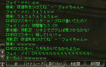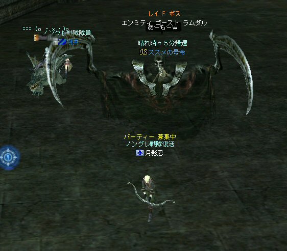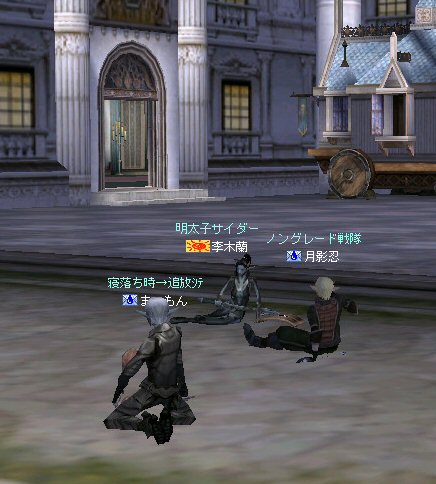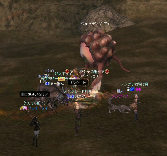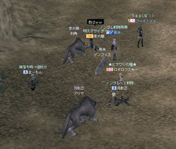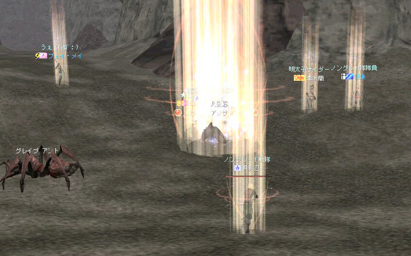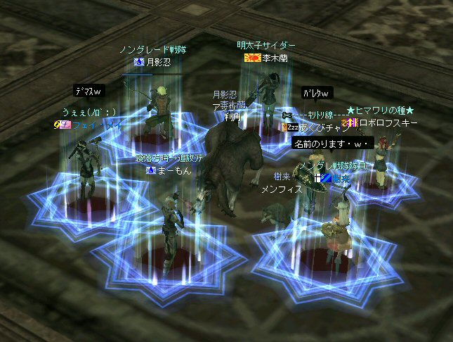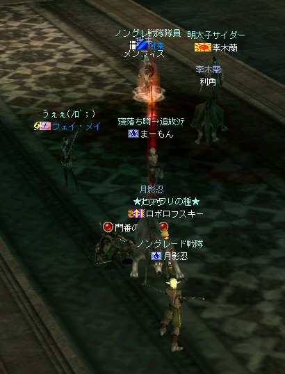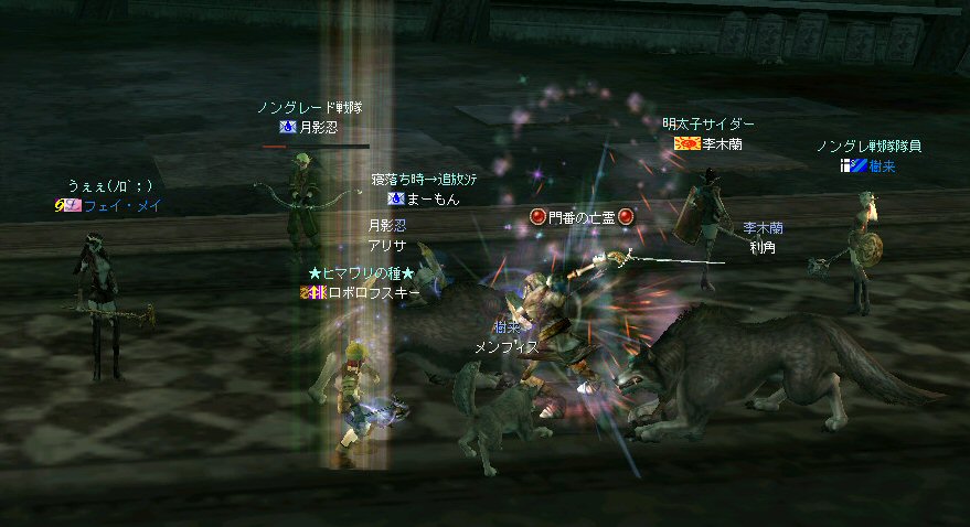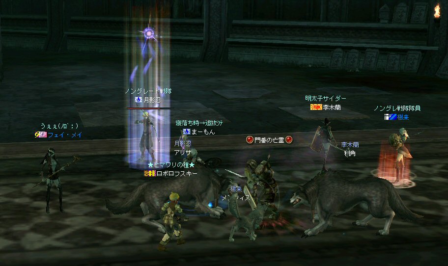 新規でロボロフスキーさん参戦。 その後ノングレメンバーの 樹来さんとフェイ・メイさんが参加。 6名PTとなった。しかし、6名では、シーレン周辺は物足りないだろう・・・。 アルゴスに移動する事を決める。 さすがに誰の目から見てもモンスターの名前はピンク以上・・・ 俺にいたっては赤黒いw モンスターの強度も増す。 一体にかかる殲滅スピードが落ちる。 モンスターに眠らされる。 近くでわいたモンスターがリンクする。 結構お祭り状態。 前に来たときはBOTが走り回っていたのに、今回に限って誰もいないw モンスターがいっぱいわく。 単品のつもりで引きに行って、いっぱい連れて行ってしまうこともw ペットの火力が高いとはいえ、逆にペットがタゲられて危ない。 で、ついに、ペットが死亡するw 利角かメンフィスか記憶があいまいだが、どちらにしても、ここはちょっとキツイ。 もう一度入り口へ戻って体制を立て直そう・・・。 23:00も回った。 そろそろ終わりの時間では有るが・・・ 今回初めての人もいるし・・・ 帝国墓地にでも行って見るか。 (実は前に来た時は、密かに向かおうとして道を間違えたw) ミッション『帝国墓地を目指せ!!』 さくっと、行って見よう! 途中、モンスターを時々狩りながら奥へ。 帝国の途中でBOTPTがいるのを発見。 全部いなくなっているわけじゃ無いんだね。 ま、6人ノングレ戦士がいれば、この辺は割りと楽に移動できる。 で、帝国墓地到着。 ラストの補助魔法が切れるにはまだ少し時間が有る。 せっかくだから狩ろう。 ここでもペットの火力はかなり助かる。 しかし、モンスターから範囲攻撃を受けてメンフィスが逝ったw まだ、進化前のウルフなのでHPがそんなに無い。 即死である;w; ペット育成の難しいところ。 飼い主の方針になるのだが、育成を真剣に考えるなら、 55前のウルフに、70代のモンスターに攻撃をしかけてはいけない ^^; レベル的に20以上はなれているんだから、受けるダメージも大きい。 で、そろそろタイムアップだ。 ノングレ帰還中に、 ちょこっと部外者(他のノングレメンバーのお友達)が乱入w まあ、載せてしまおうw (問題あるなら後で削除するので連絡を) 参加した皆さん、お疲れ様でした^^ 今週も楽しくノングレを堪能させていただきましたw ↑おまけ 一文字違うだけなのに、意味が全然違う・・・