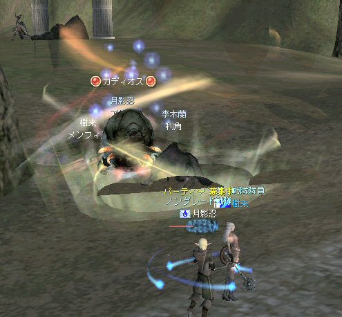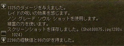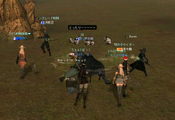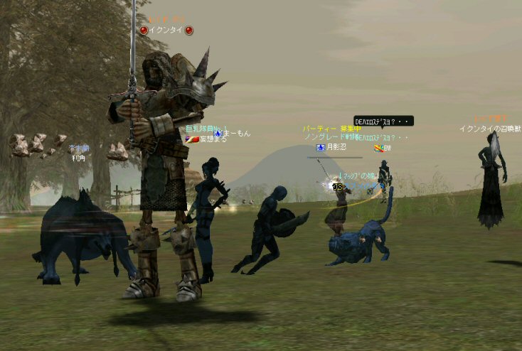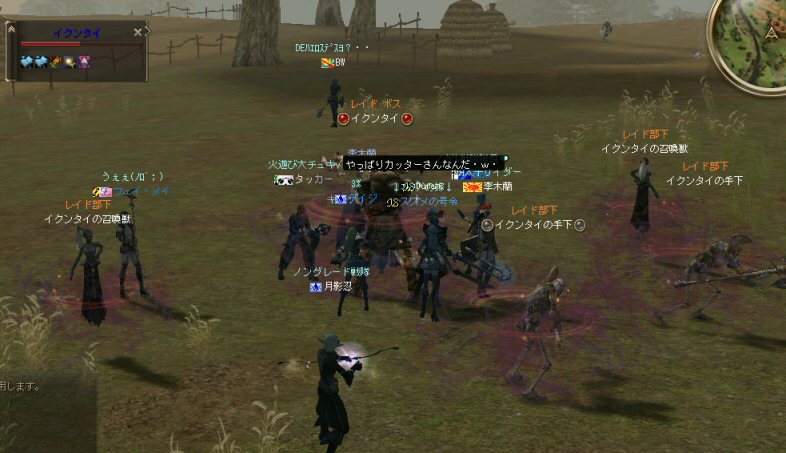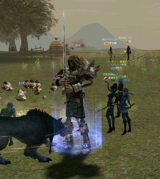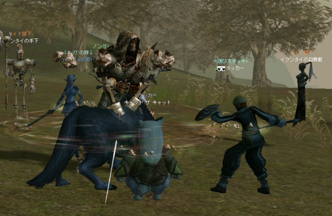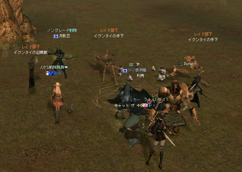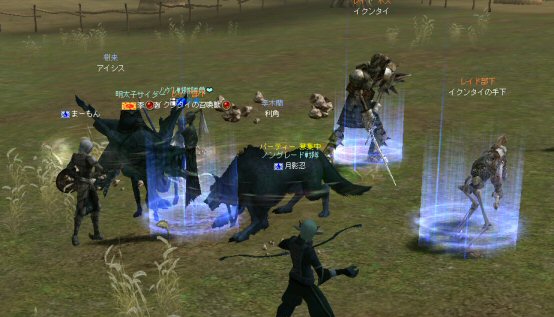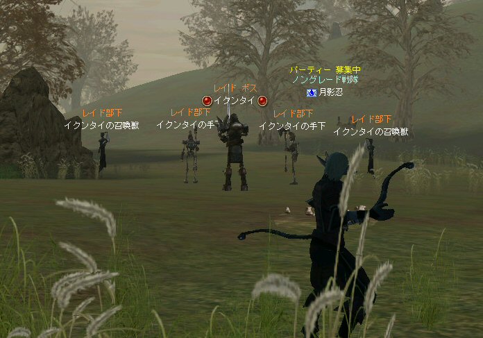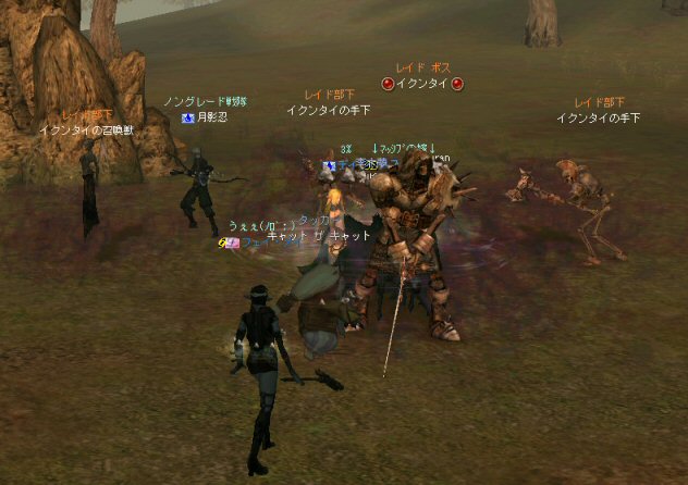 ノングレード装備によるレイド討伐は、 「ノングレードで行こう(逝こう)!」が始まった当初からのテーマだ。 悲願と言ってもいい。 過去、討伐を試み、失敗した事も有る。 なにせ、ノングレードの装備だから、本装備に比べると、性能がかなり落ちる。 反面、最上級のノングレ装備は手軽に入手でき、お財布に優しい。お手頃価格なのだ。 B装備アクセサリー一個分の相場価格で店売りの最強装備が揃って、お釣りが来る。 しかし、実戦闘に於いて、相手からダメージを受けたときの大きさは段違いだ。 また、武器にしても約半分の攻撃力となる。 まあ、ノングレの武器で、B武器の半分のダメージを与えられるのなら、上々と言えるだろう。 いずれにせよ、本装備での討伐に比べ、危険度は数倍跳ね上がる事になる。 言わば、全滅して当たり前状態に近い。 それでも、レイド討伐は本当に不可能なのだろうか? 「適正レイドを適正装備の複数PTで盾がレイドを引きつけ、アタッカーが集中攻撃して討伐する」 と言うパターンを単純にノングレで置き換えたとしたら、 通常の倍以上の討伐メンバーが必要になりそうだ。 事実、前回の討伐がうまく行かなかったのは、火力不足が原因だ。 それでは、レイドボスに勝てない。 俺は、ノングレード装備でレイドボスが倒せればいい。 何か方法は無いか? で、思い当たったのが「低レベルのレイドモンスター討伐」である。 現在の仕様では、 「レイドボスより9レベル以上のPCに攻撃を受けたりスキル詠唱されたりすると、石化や沈黙を使う。」 いわゆる『レイドの呪い』 石化効果は2分(実測)と、沈黙効果は60分(未計測、友人情報)。 石化は2分で終る。 言い方を変えると、『2分毎に攻撃する事ができる』と言うこと。 そして、特筆すべきはレイドボスに攻撃されない。 ソロで以前実験したことが有る。 詳しくはそちらを参照に。 で、前回、低レベルの猫一味で実験した。 結果、子分は倒せたが、ボスは倒せなかった。 以外にHPが高いようだ。 それで、今回はさらにレベルを下げての挑戦となった。 当初、「エルフ村の低レベルレイド」が、エルフの地下要塞に2匹いるらしい。 前夜、地図でしらべ、該当する場所に行ってみたがレイドボスは不在。 出張中らしい。 で、その日はそこでキャンプした。 「目が覚めたら、多分居るだろう・・・」 だが、甘かった。いないw で、周辺を探す。 そして、見つけたのがこいつだった。 『Lv.25:イクンタイ』 2008年1月24日(木)21:22分頃から討伐開始。 当初、俺のみ・・・ボスのHPが減っている様子は見られない・・・ でも、PTルームには何人か、参加。 いつものメンバーも、他にいないか調べてくれていたのだ。 しかし、調べて時間切れじゃ意味が無い。 参加者に声をかけ、地図を頼りに現地に来てもらった。 蘭さんのブラックメーンウルフにも、もちろん参加してもらった。 補助魔法の有効時間は20分、単純計算でも9回は攻撃できる。 シルレンの場合は、当然スキルを使ったダブルショット攻撃だ。 一人では、2分間のうちにレイドのHPは回復してしまったが、 攻撃するのが複数になると、それはレイドの回復量を上回るダメージとなる。 補助魔法が切れたら、レイドの名前が見えなくなるくらいまで離れてかける。 近くでかけると『レイドの呪い』で沈黙がかかるのだ。 ちなみに、沈黙がかかると、ダブルショットも撃てなくなる。 注意が必要だ。 補助魔法をかけ終わったらまた、石化しに向かうw そして、石化した時のポーズ。 これが結構面白い。 かっこいいときもあれば、情けないポーズの時もある。 効率を無視した、まったりレイド討伐…。 だが、少しずつではあるがHPを削っていく。 しかし、緊張感はまるで無い^^; チャットして、飲物取ってきて、トイレに行って・・・ 皆、2分間の合間にまったりといろいろ^^ レイド討伐中に、堂々とトイレにいける幸せ。 これは、普通の遊び方しかしない人にはわかるまい^^; 時にはレイドからこんな反撃がw 範囲攻撃なのだが、美しい… ダメージも大してないので、つい見とれてしまう。 通常のレイド討伐とは全く違った視点だ。 あと少し・・・ さて、ノングレードレイド討伐も大詰め。 果たして、ラストアタックの栄誉は誰の手に!? 『デイジ』さんでしたw おめでとー(^-^)ノ 23:34討伐完了 時間にして約2時間。 アンタラス討伐並みの時間だ@w@; 特筆すべきはこれかな? 経験値。 モンスター一体分ほどだが、まさか、経験値が入るとは思わなかった^^; 〆はいつものノングレ帰還です。 皆さんお疲れ様でした^o^)ノ 今回は、スピードを要求されない討伐なので、グラフィックもクオリティを上げておいた。 おかげで綺麗な景色が楽しめた。 リネージュ2のグラフィックは本当に美しい。 光と影の具合。木陰、緑の木々や草花。高低差のある地形・・・実にリアルだ。 幼い頃に駆け回った公園や自然の風景に、どこと無くかぶる色合いだ。 本当に、みんなで野山に出かけて、遊んだような雰