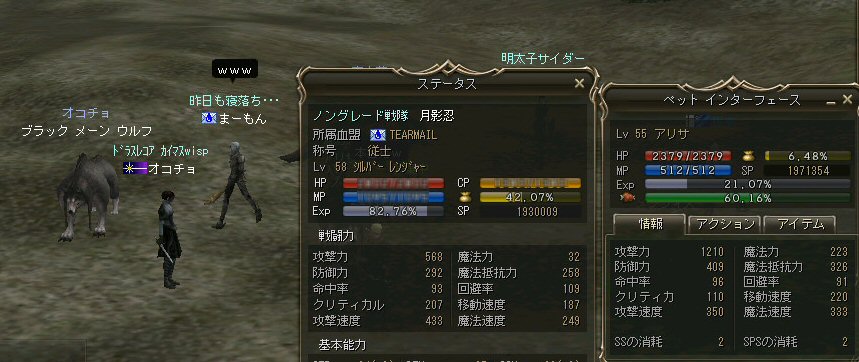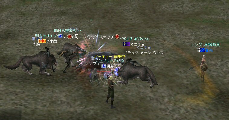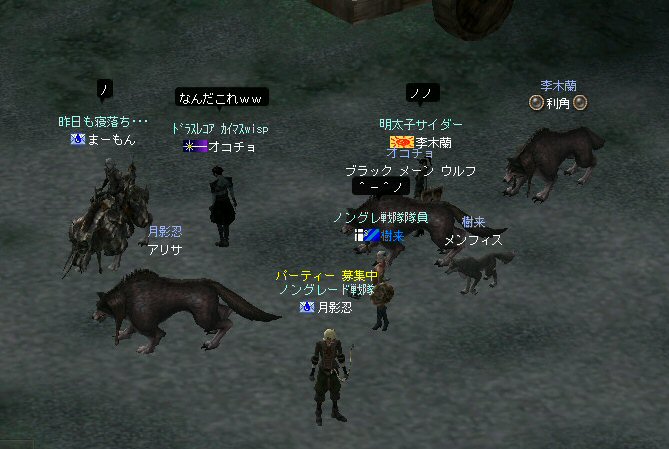 先週、先々週は『石化レイド作戦』で自分的には盛り上がっていた。 しかし、自分がこれと思った目標を達成すると『燃え尽きた』感に襲われる。 今週も『石化レイド作戦』? いや、それはもういい・・・続くと飽きる;w; ちょっと危険な狩場に行くのも今ひとつ。 んー、どうしよう? 最近、姉貴のかわいがっていた犬がついに55歳を迎え、 ブラックメーンウルフ(別名:BMW)に進化した。 いままでの『ウルフの育成』の仕様では、ウルフの貢献度が経験値に反映されていた。 モンスター一匹をウルフ一匹で倒した場合、貢献度100%となり、経験値の全部がウルフに入った。 俺の様なアタッカーでは、モンスターを倒す火力が高く、 ペットが貢献する間も無くモンスターを倒すため、ペット育成には不向きな職と言えた。 ところが、『ファーストスローン』になってから、ペットの仕様が変更になった。 モンスターを倒した時の経験値が、キャラクターとペットに分け与えられる様になった。 で、目に付いたのが『ペット』 そう言えば、ノングレでペット育成はやった事が無かったな・・・ 面白いかも^^ という事で、50代半ば定番で、かつ、ノンアクのモンスターの狩場。 クエもあっておいしい「国立墓地」へ。 ところが・・・ ノンアクの狩場の筈が、アクティブがわいている。 血盟クエストの残骸。経験値0、やたら硬い奴だ。 クエが終ったら掃除して行って欲しい・・・。 このまま放置して、ペット育成はできないので掃除。 ソロではないので、楽ではある。 もちろんペットにも掃除に参加してもらった。 蘭さんの「利角」ブラック メーン ウルフ 樹来さんの「メンフィス」ウルフ 俺の姉貴の「アリサ」ブラック メーン ウルフ その後、タイク オーク ウオッチャーを餌にペット育成を・・・。 慎重に事をすすめる事は悪い事ではないと思う。 まして、今回も試した事の無い未知の領域だ。 しかし、普段のノングレよりも簡単に狩れている様な・・・。 少しモンスターのレベルアップを行うため、徒歩でシーレン側に移動。 途中のモンスターもリンク処理をしながら各個撃破。 もちろん、ペット主体でだ。ウルフにはちょっとキツイ狩場かもしれないが、 ブラック メーン ウルフなら大丈夫そうだ。 シーレン側でも、モンスターを普通に狩れる^^; ドラゴンも芋虫もサチコさんも・・・大丈夫。 ドゥーム ナイトだけは、範囲があるのでやめた。 「アリサ」がウルフだった頃、瞬殺された事があったからだ。 ドゥーム ナイトの範囲でスタン+1000位持っていかれる。 (普通に本体の俺も危ない^^;) その後、まーもんさんとオコチョさんが参加。 オコチョさんから「ケトラー アウト ポスト」へ行って見たいと熱烈な希望がw。 頭の中で「危険」レベルを超えている感触・・・嫌な予感。 ノングレ戦隊でペット無しなら、別に問題は無い。 いつものデンジャラスな遊びだし、実績も有る。 今のメンバーなら、全滅も無いだろう。 だが、ペットは違う。 そう、車で言うなら、今は慣らし運転。 ペットの可能性と能力を、ノングレPTを通して把握している段階だ。 下手したら一撃でアウトだ。 (アリサ死なせたら、俺が姉貴に殺されるw) <--- びびってる---<<< しかし・・・ 今行かなかったとしても・・・ いつか必ず行くだろう・・・ それが俺達、「ノングレード戦隊」だ・・・ orz んで、現地でモンスター引いてて俺だけ即死w いや、HP超えるダメージ来たら、どうにもならんw 幸い、他に隊員やペットに死亡者無し。 言っておくが、俺は通常、よほどの事が無い限り死なないw しかし、今回はペットが足かせになる。 ペットは可能な限り、死なせたくないのだ。 (死なせてたらペット育成PTにならんw) 俺的には「ケトラー」は撤退と結論。 近場でもう少しレベルの低い「アルゴス」がいいだろう。 どうしても「ケトラー アウト ポストでなきゃ嫌だ!」と言うのであれば、 希望者だけでやってもらうしか無いだろう・・・ 「ケトラー」でやりたいとオコチョさん。 オコチョさんとは、ここでお別れかな? ・・・と思いきや、違ったらしい^^; アルゴス到着。 スナッチも鹿も、サクサク狩れる。 いい傾向だ。 しかし、サクサク狩れる。 んー・・・ いつものノングレよりも殲滅スピード早くないか? オコチョ:ワンコだけでいけるんでないw 李木蘭:かもw 樹来:WW オコチョ:一言 オコチョ:ワンコの方が防御たかいww (月影:そんなバカなw) 李木蘭:wwwwwwwwwwww 樹来:wwwwww まーもん:w 樹来:攻撃もねw (月影:いや、ひょっとして・・・) オコチョ:今知った・・・w (月影:確かめないと・・・) 月影忍:ぬ (月影:ステータス、ステータスと・・・)<- ペットと自分のステータス調べてる オコチョ:5倍くらい違うw (月影:あれ?) 李木蘭:ぶw (月影:え?) まーもん:www (月影:えええ@w@) 月影忍:本当だw たしかにBグレ並の値段する装備つけてるからなぁ・・・ノングレのくせにw ちなみにブラック メーン ウルフ専用武器の値段(参考に) 強化ウルフの牙: 4,411,200a 強化コヨーテの牙: