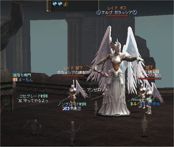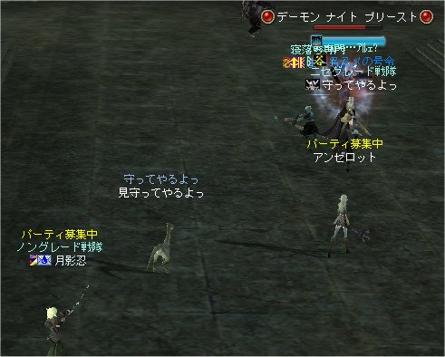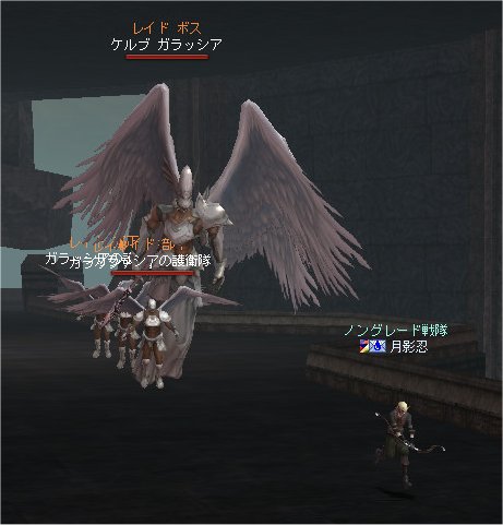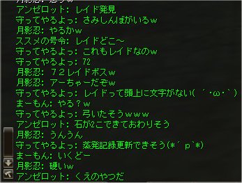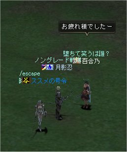 10階を、さっさと通過し、最上階を目指す! なw! 懐かしい!! 久しぶりに見た。まだ、生存していてくれたのか。 武器クエの時の対象レイドボスだった。今はどうなのだろう? とにかく硬くて、タゲ跳ねもよくした。ヒーラー泣かせのレイドボスだった。 ヒーラー職の姉貴も、予測不能のタゲ跳ねでよく死んでた(戦闘不能状態)。 苦労する分、倒したときの達成感は、なかなか楽しめたレイドだ。 それが・・・・・・・・・・・・・・・・・・・・・・・・・マジですかTwT; 何か、もう・・・言うべき言葉が見つからない。 システム的に、だいぶ変更が入ってたから、いろいろ変わっているんだろうなと・・・。 魅力だったレイド討伐のキーポイントだったのにね。 ここでは、危険度が上がって、連合内のPTでも、緊迫感があった。 ヒーラー職はタゲはねが起こっても、攻撃を受けている対象者の死亡を阻止し、 盾職もヘイトでタゲを戻して討伐するという流れに一体感があったと思う。 みんなで協力したからできる繋がりが好きだった。 そんな楽しいと思った仕様が、またひとつ、壊れていた・・・。 まあ、別の魅力があるならいいんだけどね・・・。 (その別の魅力を、俺はまだ見つけることが出来ていないし、無いかも知れんw) 同じ階の別のレイド。ここは、変わっていないらしい。 そして13階。 やっぱ、グラフィックのセンスすげーw そして、ここにもレイドが居る。 …って、 オイ!! いきなり手を出す所は、ノングレード戦隊の正式隊員に匹敵する愚行(?)だw。 こうでなければ、ノングレード隊員は務まらないw ノングレード戦隊に入隊しなさい!! お陰で、守ってやるよっさんは、 経験値が減った。 HPが減った。 慎重さが減った。 すばやさが減った。 運が減った。 レイドのティミングに成功した。 (ぴろろ~ん♪) 隊長が、見本をみせちゃる!! ・・・・・・・・・。 冗談はさて置き、死なないよう引き回していたら、 13階とバイウムの階が階段で、ループしている事がわかった。 これは、新しい発見だった。 しばらく追いかけっこを俺は堪能したんだが、 他のメンバーは呆れていたかも知れない=w=; 不思議と、他愛ない、こんな追いかけっこが楽しかったりする。 死ぬかもしれないリスクと、 NPCになんとか一泡吹かせるような、そんな行為が出来ないだろうか?とか この装備で殲滅できないだろうか?とか いろいろ考える。もちろん選択肢はあまり無い。 逃げ切ったら『勝ち』が基本かな。 だけど、狩りや戦争以外にも楽しみ方ってあるんじゃないか? どんな事をしたら楽しいんだろう? 自分達はなにをおもしろいと感じているのだろう? ある意味、開発側の想定外の遊び方を見つけられたら俺達プレイヤーの勝ち! 決められた環境の中で、遊び方を創造、発見し、産み出す。 『有る物で賄う』が基本だから、装備とかも関係ない。不足は気合とチームワークで補う。 それが「ノングレード戦隊」なんだと思う。 そんな視点から、今のリネージュⅡを見てみると、 開発側の傲慢さや、クレーマーに対しての過保護さが見えてこないだろうか? 仕様がどんどん縛られ、自由度がどんどん奪われる。 ゲーム内の自由度が奪われる=ノングレードでの遊びの可能性が奪われる 開発側の「こうやって遊べ!」が俺にとっては息苦しい… 以前は5分間、魔方陣のゆったりした変化を楽しんでいた(前にも同じ事話してるよね?)。 今回もノングレード戦隊恒例のフォーメーション組んで、『5分帰還』を懲りずにやったが… 今、エフェクトは30秒で消える。 ススメさんが主催した『5分帰還イベント』は、もう出来ないだろう。 ノングレード魂全開のイベントで、とても好きだったのに。 ま、木曜恒例のノングレード公式イベントは、今回で終了だ。 みんな、参加してくれて、有難う^^ たのしい時間を過ごす事ができました。 m(_ _)m また、無料期間があって、縁があったら、またやろう。 その時、知り合いが残っていればいいが…(;T△T;) (もちろん、一緒に無料復帰でもおk) PR