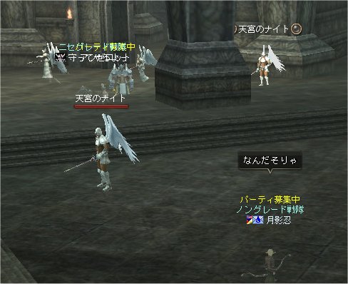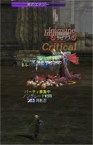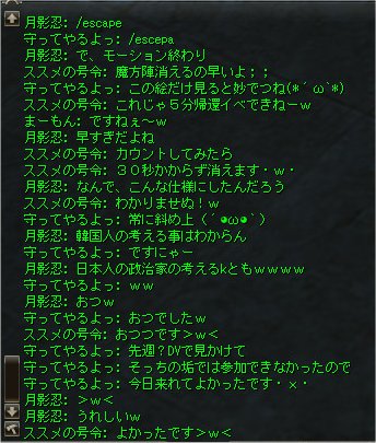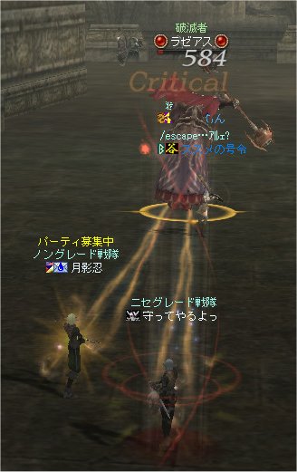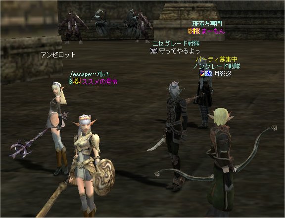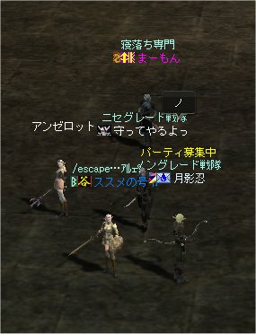 どこかで見たことのあるような・・・ たしか、どこかで叩いて遊んだ気がする・・・ なぜ、こんな所に? こいつ、門番とか仕事サボってこんな所に? お仕置きだw NPCでこんな所に配置されているから、反撃してこないのかと思いきや、 しっかり反撃されて死んだwwwwwwwwwwwwwwwwwwwwwwwwww (PM:モニターの前で吹きましたw) ならば、やるしかあるまいw 叩いて!逃げる!!!!!! アデン中央広場で、鬼ごっこw だが、やはり糞な仕様だ。門を出る前に、定位置へ戻っちまう。 はぁ~。少しは遊べる仕様にしてくれよ~;w; ま、NCに期待しても駄目か。 クリティカルでダメージ14って、こりゃ倒せんな。多分=w=; 高レベル仕様にシフトしたのかもしれない。 ノングレード戦隊にとっては、冬の仕様だ。 そして春が来る事は、恐らく無い =w=;