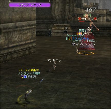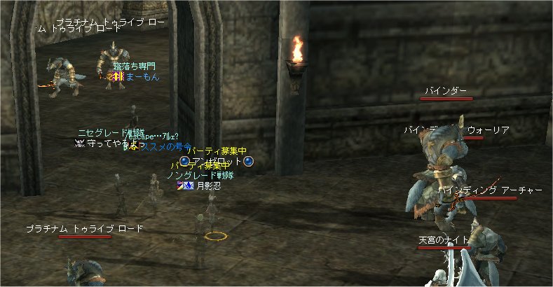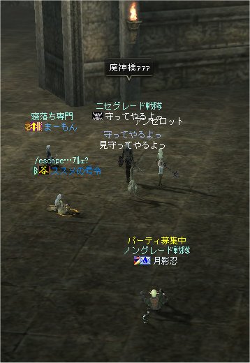 ひっそりと「ノングレードで行こう!雑談部屋」を開いて、有志と遊んだ。 コレについては、また後日に記そう。 2012年5月24日(木)21:00~ 「ノングレードで行こう!」を行う。 イベントの告知をした所で、PTメンバーが集まらないのが、『ノングレードクオリティ』。 もっとも、レベル差無用のノングレード装備のパーティで、旨みなんて無い。 ・防御力・攻撃力とも激減し、殲滅までの時間が大幅にアップ。危険度増大。 ・パーティ内のレベル差でプレイヤー(俺も含むw)に経験値が入らない場合がある。 ・真っ赤な敵モンスターを倒しても経験値は入らない。(今回の仕様変更っぽい) ・死亡した場合は、ほとんどの場合ノーマル復活スクロールか、最寄る為、 経験値を失う。 ・ポットや秘薬など、生存する為に使用する為、コストがかかる。 ・普段使わないような、ノングレードのSSを購入し、それを消費する。 コレだけでも、ノングレード戦隊を知らないプレイヤーは、手を出さないだろう。 経験値を貯めて、早くレベルアップして、装備を調えて、対人戦闘やりたいwww と言う、NCの思惑通りの人たちには、ノングレード戦隊の気質は合わない。 日々、定められたクエストをこなし、 効率よく経験値とゲーム内通貨を貯めたいのであれば、 邪道とも言える「ノングレード戦闘」に興味など持つはずが無い。 きっと俺が向こうの立場なら、 「また、バカな連中が、非効率なイベントして…暇人共め…」とか言いながら、 白い目で見ているだろう。 「対人戦闘を有利に進めるためには、レベルと装備と資本金だwwwww」とか 言ってるかも知れないw(基本、クリックゲーなので、テクニックは二の次w) だが、それでも集まるプレイヤーが居る事実は何を物語るのか!? 少なくとも俺は、効率や装備よりも気の合う友と遊びたいのだ。 リアルではなかなか知り合うチャンスが無い中、 同じ様な価値観だったり、 有志があつまる正当なマイノリティ(少数派)グループプレイだ。 故に、毎度あつまる(新規も含めて)参加者は、個性的だ。 それは単純に『面白いから』に他ならないからだと思う。 NCの開発側が考えた「箱庭ゲーム」で満足するプレイヤーならいい。 俺たちはその上を(ななめ上?)を行くのだw こんな事だって想定内!! (嘘w 弓が居るのを忘れてましたw) ノングレード戦隊のPTで、通常戦闘不能(死亡)状態の場合、 何も準備がなければ最寄る。 もし、ノーマルの復活スクロールを誰か持っていて、復活してくれれば御の字で、 経験値復旧とか無いのが当たり前と言う前提がある。 そして、リザ(復活)や祝福された復活スクロールを使うか否かは義務や強要でなく、 PTに参加したプレイヤー本人の自由意志による行為だ。 だからこそ、ヒーラー職が居てくれて、経験値の復旧までしてもらえると、 本当にありがたいと感じられるんだ。 さて、2階は珍しく、他のPTが使っていた。邪魔にならないよう4階へ向かう。 途中、配置(役割?)の変わったモンスターを叩く。倒せるぞ!! (俺は適正だが、他のメンバーは真っ青なので、俺も含め、誰にも経験値が入らないwww) ススメさんが、約1時間遅れて参加。火力アーップwwww しばし4階の分裂型モンスターと戯れる。 他のメンバーから見たら真っ青かもしれないが、周りを囲まれボックス化すると、 高レベルでもフルボッコで倒される事がある。注意は必要だ。 ・・・がw タゲが俺に移ったwwwwwwwwwwwwwwwwwwwwwwwwwwwwwwwwww と言うわけで、足を使って逃げる! 相手の足が遅いので、しばし、3階の踊り場で鬼ごっこを楽しんだw (最後は倒したけどねw) しばし遊ぶが、ゆっくりしていると最上階に辿り着けないw 5階へ行こう!! つづく