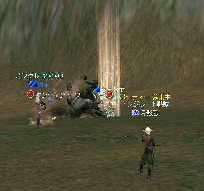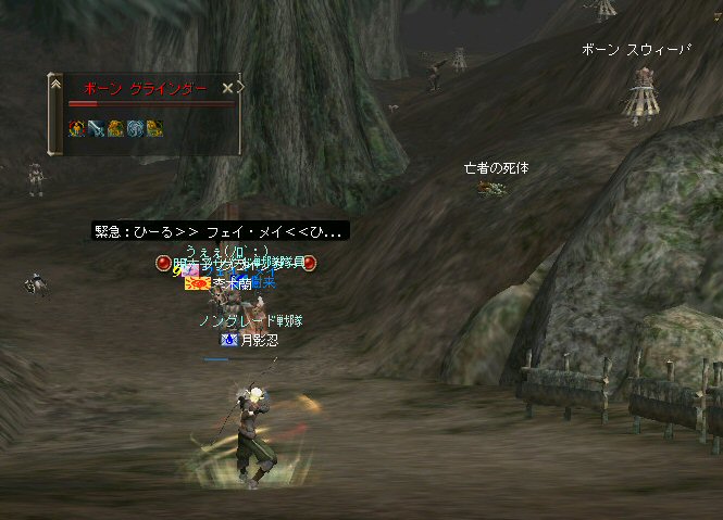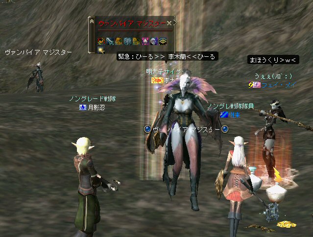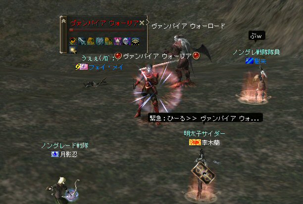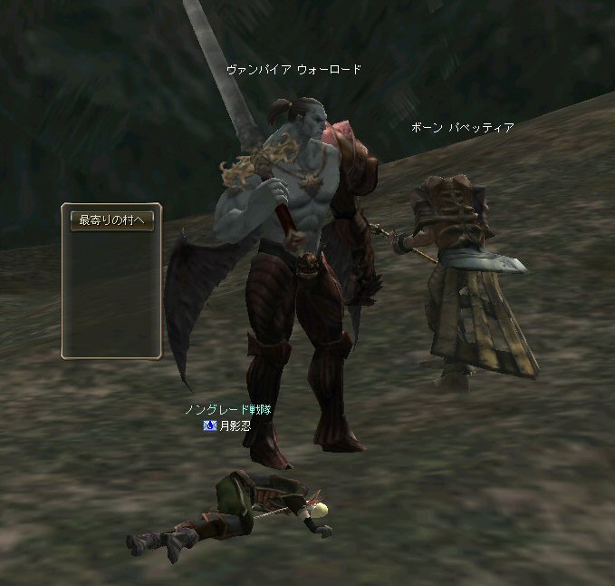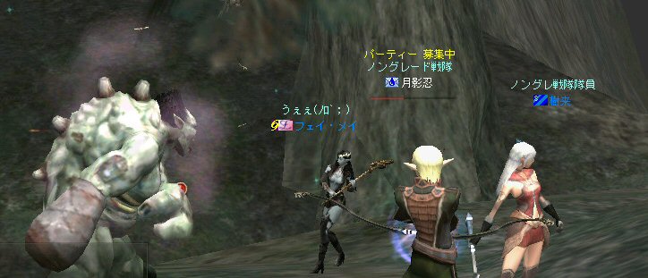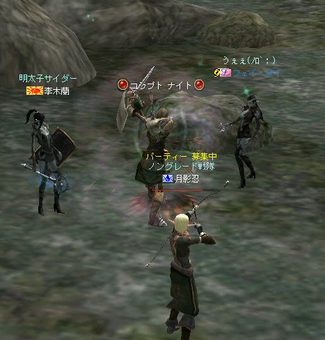 「さすがに今日は厳しいかな?」とそんな考えが頭をよぎる事もある。 言い方を変えれば、「本気な人しか集まらん」とも言えるだろう。 そして、集まったメンバーは、紛れも無く「本気」なメンバーだった。 (いや、定例メンバーなんですけどね^^;) 今回はルーン地方の「亡者の森」だ。 移動しようと言う事が決まって、 ゴダードからGKで飛んでみたら誰もいない。 俺はあまり考えずにGKを使ったが… どうやらルーンへ行く帰還ポイントがあるらしい… 地図をみるとみんな走っている。 「ああw、俺も一緒に走りたかったw」 (ちょっと寂しがり屋の俺w) まあ、それは置いといてと・・・ ここは、以前全滅した危険な狩場だ(もっともペアだったが)。 入り口から慎重に攻略に入る。 いけそうだ。 しかし、リネ時間で、昼間だからまだいいのかもしれない。 よる時間になると、様相が一変するのがこの狩場。 ちょっと固めで嫌な奴だがこいつも何とか処理w しかし、奥に進むにつれ、危険度が上がる。 この、ボーンなんとか類が曲者。 アクティブな上、魔法攻撃で激しくHPを削ってくる。 まして、魔法攻撃に弱いノングレード戦隊には致命的とも言える攻撃だ。 慎重に奥地まで進入できていると思ったが、 急にHPが減った。 「え?」 PTメンバー見ると、 一人HPがすでに無いw 「ええ?」 近くを見渡しても、周りに敵がいないw 「どこだ!?」 どうなっているんだ!? 敵はいる。それも近くに… また、HPが減った。 吸い取られ、飛んでいく俺の生命の光…どこへ飛んでいく? 生命の光はゆっくり後ろ上方に… 「なに!?」 近くに大きな岩があった。 通常視点では、頂上は見えない。 見上げてみればそこに… 盲点だった。 すぐに反撃開始。スキル全開で矢を叩き込む! 真っ赤な敵だからちょいと硬い。 通常の攻撃で外れる事もある。 こっちもザケン討伐で稼いだ高級体力回復剤でHPを回復しつつ相手のHPを削る。 そして 「あと一撃でw」 って時に、ちょっと遅かったらしい…。 『最寄の村へ』 が出ちまった。 ノングレード戦隊壊滅w 最近、全滅とか無かったから… 後一撃で倒せたのに… 不意を突かれた… いろいろあるんだが、 感情的には『悔しい』www で、村で体勢を立て直し、再度、亡者へ 同じ失敗は繰り返さない(つもり) 同じ様な敵を見つけては撃破w さらに奥へ進んだ。 また、モンスターの様相が変わる。 今度はヴァンパイヤのお姉ー様やお兄様達との死闘。 ちょっと硬いのが難点。 リンクしたw 樹来さんの緊急リコ発動w しかし、俺に関して言えば、0.5秒遅かったw 最寄って村でノングレード(5分)帰還w 参加した皆さんお疲れ様でした^^; それにしても、今回は、『口惜しい』と言う感情がちくちくと胸を刺す。 俺にしては珍しい事だが…個人的に屈辱感だなw 地の利が悪い事も影響はしている。 障害物はそこかしこにあるのだが、同様にそこかしこにモンスターがいる。 逃げ場が無いのだ^^; 詳しく言えば、 傲慢なら安全な通路に引いて各個撃破。 シーレンやアルゴス、シレノスなら開けたフィールドでルーツで各個撃破。 リンクしても、足を活かして逃げられる。 サイレントバレーのPTモンスターも、 単品を「チャーム」で引いて同様に処理ができる。 障害物と言う点では、 補給品クエのモンスターも国立墓地の墓標を障害物として足止めやスキルカットに利用している。そばに邪魔になる高い障害物が無いから移動ポイントを指定しやすい。 つまり、足が活かせるのだ。 亡者は障害物はあるのでスキルカット等可能だが、 背の高い障害物が多いため、 移動したいポイントへ思い通りにいけない場合が発生する。 足場も悪い。MOBの魔法攻撃は痛いから、もたもたしてもいられない。 障害物の、その向こうに同様のアクティブモンスターがいる可能性もある。 足が活かせない。 経験値も10%くらいロスとした。 なので今日は、ちょいと凹んだ^^;