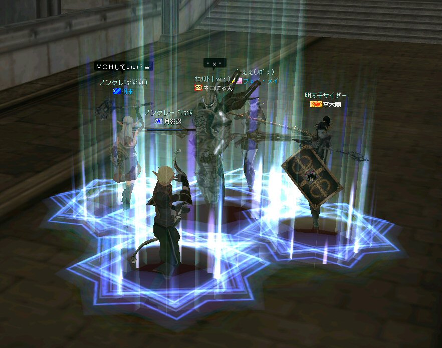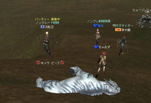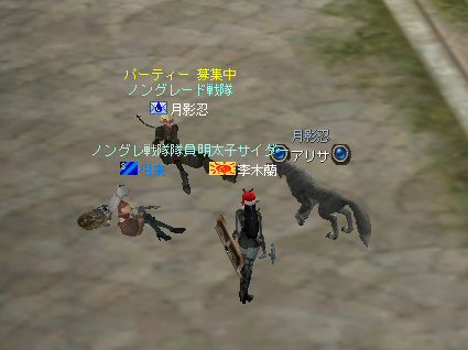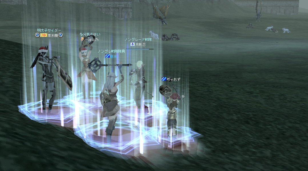 最近参加するようななったメンバーで、まだPTモンスターを体験していない人が居たから選んだ。 サイレントバレーはモンスターのレベルも高く、 PTモンスターを倒す練習に丁度いい場所だ。 メンバーは当初、俺と、蘭さん、樹来さん、ちゃおずさん。 今まで確立された方法としては「チャーム作戦」がある。 やり方は以前にも紹介したと思うが、念のため。 ①チャームはPTモンスターの子供にかけると、単品で引きが可能なスキルだ。 本来は攻撃意欲を削ぐ為のスキルだが、PTモンスターの場合は、単品にだけヘイトがかかる様だ。なので、チャームをかけて、一匹だけ引く。 ②有る程度本体から距離を置いて、引いてきたモンスターにルーツを掛け、足止めする。ちなみに引く距離が長すぎると、子供は途中で勝手に帰ってしまうw。ルーツを受けると、親が気付き、残りの子供を連れてこちらへ移動を開始する。 ③全員で攻撃。もちろん、近接で殴ってタゲが自分に向く事も有る。危なくなったらモンスターから離れてHPを回復するのは基本だ(気にせずに叩いてるメンバーも多いのだが・・・=w=;)。遠距離攻撃の弓職や魔法職は、その大きな火力を使って、一気に相手のHPを削る。親と子供達が到着する前に、単品の子供と倒す。 ④後からくるモンスター達は、基本的にTLが狙っているモンスターに集中攻撃し、各個撃破する。ヒール職は他のモンスターはルーツやスリープ(トランス)をかけ、行動を制限し、すぐにTLのモンスターを叩きに行くw モンスター殲滅は、急を要する。 ヒーラーも叩けるだけ叩いてHPを削るのが基本。装備の防御力が弱いので、ヒールするタイミングも見計らわなければならない。恐らく普通のPTより、忙しいポジションだ。 まあ、『チャーム作戦』の概要と言う事で。 ただ、これは俺がたしか55あたりで使っていた方法だ。 すでにほぼ確立されている方法なので、新鮮味は少ない。 なので、今回は直球勝負をw いきなり親にダブルショットを加える。 当然モンスターがみんなやって来るんだが、『チャーム作戦』を開発していた頃は、ヒーラーは一人しかいないことが多かった(毎回、蘭さんが出てくれてた) 今回はヒーラーは、シリエルにエルダー、二人居る。 豪華だ@w@ ルーツとトランスで、モンスターの足を封じ、強引に各個撃破。 殲滅できた。 ヒーラーが二人いたから出来た技?だなw。 ヒーラー一人で癒し魔法(ヒール系)と妨害魔法(デバフ系)を受け持つのは負担が大きすぎる。 MPも限りが有るし。 で、新たに参加者。 ビショップの百合乃さん。 ===降臨=== ヒーラーがさらに一名増えた^^v チャーム作戦だけじゃなくて力技でかなり無茶も出来るかも。 ただし、安心は出来ない。 気を緩めているといきなりHPが9割削られる事だってあるのが日常のノングレード世界だ。 で、残りはこの5名でサイレントバレーのPTモンスター殲滅を堪能した。 (PTチャットでおしゃべりしていた時間の方が長かった気もするが・・・) いくらモンスターを倒しても、きりがないサイレントバレー。 それは、近づく人間を近寄せまいとする大いなる意思の存在のなせる業なのだろうか・・・ 遠くから見つめるPTモンスター達の瞳には、 我々の姿は果たしてどのような姿に映っているのだろう。 モンスター達の視線を他所に、俺達はノングレード帰還する。 そう、新たな伝説を求めて・・・。 という事で、お疲れ様でした>w<ノ ↑ちなみに百合乃さんの持ってる短剣 「スケルトンダガー」と言うらしい。 C1(クロニクル1)前のOB(オープンベータテスト)時代に存在していた物らしく、現存している物意外、入手不可能なレアな一品らしい。 おまけ 樹来さんが城主になりました。 ワイバーンでお披露目です。 嘘です。 ネカフェイベントで5分間だけ乗れるアイテムが有るみたい。 いいな~^-^;