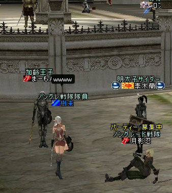 先週は、修道院へ行ってきた。 もちろん、内部での戦闘は生還不可能なので、引き狩りではあったが、 レイドモンスター化した、天使やら死神みたいなモンスターとの戦いを堪能してきた。 危機的状況になっても犠牲者はペットのみだったと記憶している。 しぶといぞ!ノングレード戦隊w 今週は、果たしてどんな冒険が待っているのだろうか!? 巷では、QAや武器クエレイド、ザケン等々王道のイベントがてんこ盛りの日の様だが、 ノングレの定例会は、本日も開催予定^^v 趣旨:血盟、種族、レベル、装備等々の枠を超えて、ともに冒険を楽しむw 日時:本日も21:30~約1~2時間。 場所:アデンの中央広場 冒険先:未定(集まったメンバーで相談) 参加資格:全身ノングレード装備で2次転職済みの方ならどなたでも(50以上が望ましい)。 害血盟(迷惑行為を楽しむ血盟)の方や無差別PKの方はお断りします。 注意:死亡する可能性もありますので、死亡しないための準備、した場合の準備を忘れずに。 (死にそうになっても、あきらめず、生き残る努力をw) あと、ブログに載せてますので公開可能なキャラクターで。 PTMは開きますが、枠がいっぱいになったら〆ます。 ノングレメンバーは極力参加をw (リアル優先で、可能ならね) では、夜に。 ========================================================================= と告知してきた。 最近、ノングレードがまた、面白くなってきた。 単衣に集まる参加者が面白いからに他ならないと思う。 参加者が喜んでくれると、主催した方もうれしくなる。 むかしは、 遊ぶものとか、あまり無かった時代は、 近くの友達と遊びを作り出していた事を思い出した。 今の時代は外に出なくてもTVゲームもネットゲームもあるし、 外にでると逆に危ない人がいるから外で遊ぶ事自体が少なくなってきてるみたいだ。 でも、人が作ったゲームは人の作ったルールで成り立っている。 自分たちで考えないで済む分、応用がきかない。 当たり外れもある。 でも、自分たちで作るあそびは、ルールだって自分たちで作る。 面白ければ、また同じ遊びを繰り返すだろうし、 つまらないと思えばルールを変更する。 そんな当たり前のことが、今は「仕様がこうだからいいんだ!」とか 「仕様が悪いからどうの」とか…。 全員が同じ遊び方を強要されるゲームは長続きしないだろう…。 だれが戦争ゲームだって? だれがPKゲームだって? だれが狩りゲームだって? だれが金儲けゲームだって? 「そんなの関係ねー!!」って奴だな。 リネージュ2の遊び方に於ける仕様は、かなり自由度が高い。 その仕様の中で、 いままでと違った遊び方を見つけられるかどうかと言う視点も、大切だと思う。 また、同じゲーム環境の中で、別のゲームをしている人がいる事を忘れちゃいけない。 それは、ゲームを楽しむ者の暗黙のルールだ。 「無差別PKあそび」なんてもっての外だな 修道院でであった血盟戦中の人達は、ノングレード戦隊には手を出して来なかった。 遊びが違うから、干渉しないと言うスタンスかどうかは知らないが、 (気配りしてくれたのかな?) 無事「ノングレードで行こう!」ができて「ありがたい」と思った事を追記しておこう。
