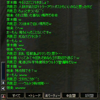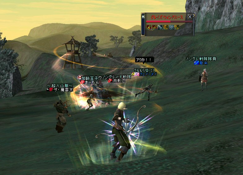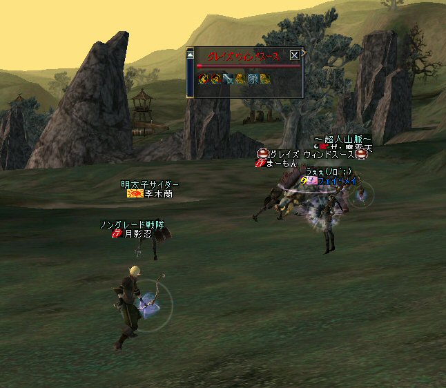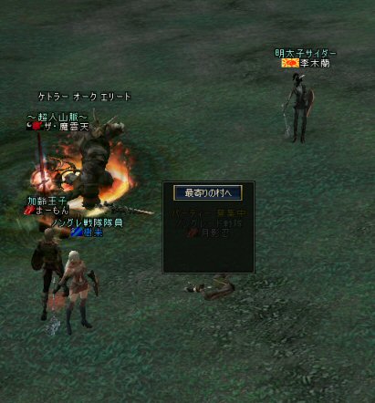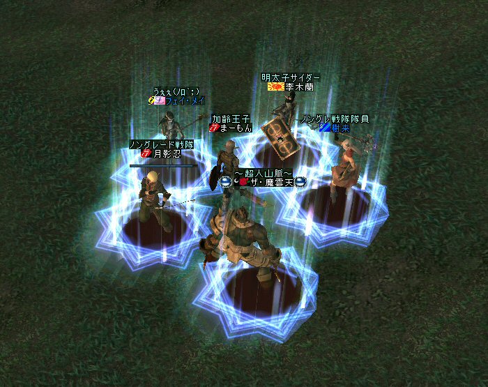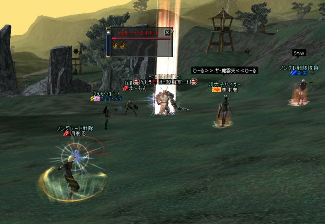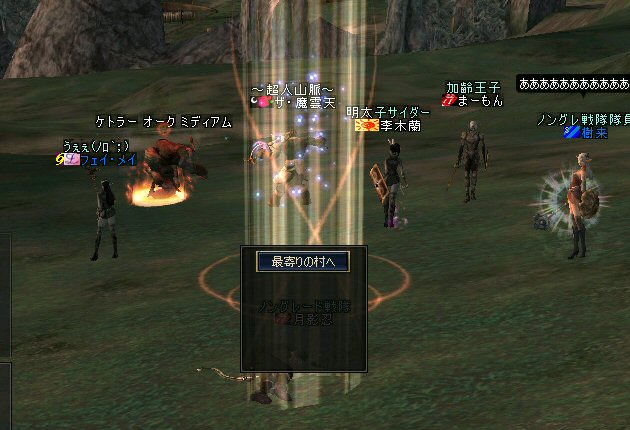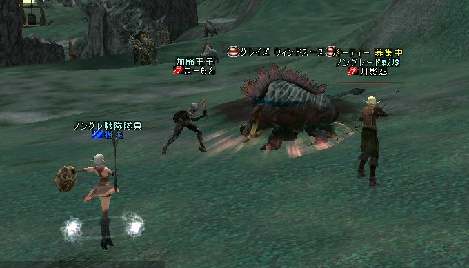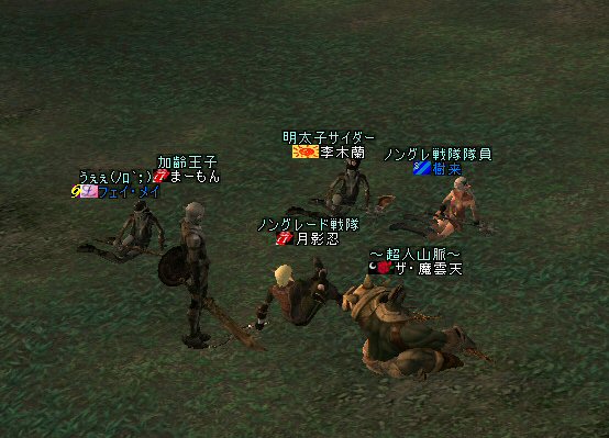 弓職の火力は大きい。 ノングレード戦闘では、かなりの火力のウェイトを占めると思う。 (WIZにはかなわないかも知れない^^;) それが倒れる=火力が消失=部隊全滅ともなりかねないのだ。 前回、逝ってしまった俺は、リザで復活した。 さすがに魔法系は痛い>w<; しかし、火力とヒールに余裕があったおかげで全滅はしていない。 全滅はしていないが、消耗は激しいw そろそろタイムアップの時間だ。 一休み後にラストアタックをかけよう… 「じゃ、これラストでw」 とか言いながら、結局、数体倒すパターンが最近多い^^; でも、みんな、同意の元で、やってる事だし、何より、「楽しい^ー^」 だが、時間が延長されると言うことは別のリスクも発生する。 みんな、リアルプレーヤーは働いているんだ。 疲れも出るだろう… トラブルは突然やってくる …寝落ちだw 騒いでも起きないし、殴ってもなぁ…と言いつつ となりの人と殴り合ってみる。 CPの飛び具合を見て、スキルを使った場合はノングレでも十分危険な事を確認したw 最後に、寝落ち者を囲んでノングレ帰還発動。 『仲間が去った後、寝落ちした彼は、アクティブモンスターの餌食となり、 次の冒険者がお腹から救出してくれるまで、胃液にまみれて暮らしました。 めでたし、めでたし…』 と、ならないように、リコして村に連れ帰りましたw 数分後… みなさん、お疲れ様でした^^;