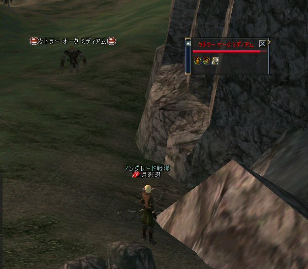 脳裏をよぎる「グレイブ エルダー バッファロー」1体に全滅させられたあの日々… ノングレケトラーアウトポスト全滅記 (2006/08/24:ノングレ9) あれから1年以上経っている… しかし、心の傷はなかなか癒えない。 月影忍「火力も無い、防御力も無い、メンバーだって不足気味だった…。 しかし、単に相手のレベルが高かった位で全滅かw…」 (普通の人なら多分、近寄らないと思う・・・) 月影忍「真っ赤な敵は怖くは無い。しかし、 『全滅した=負けた』ままでいいのか!?」 月影忍「否!断じて否!!」 頭の中で俺の叫びがこだまする・・・。 続々と集結する猛者達。 しかし、人数的にはキツイ。 『ウルトラ特攻隊』・・・ =w=; こうなってくるともう、数より気合だなw 思考は現実化する・・・。 結局、来てしまった。 いや、「来たかったから来た」だなw 惨劇のあった場所も、たしかこの辺だった。 早速戦闘開始・・・だけど、あの時、こんなのいたっけ? こいつも初めて見る奴だし・・・モンスターの配置が変わった? 大型アップデートが間にあってインタールードになっている。 あの惨劇の日から近寄らなかった場所だから、配置が変わっていたとしてもおかしくはない。 (参加人数が少なすぎて近寄れなかったと言う話も・・・) ま、危険な事には変わりないがw 遅れて参加した人とも合流し、徐々に火力が上がっていく。 まあ、当時よりは俺もレベルが上がってるし、参加者のレベルも60超えの人が多い。 きついけど、倒せる。 このあたりは、俺のレベルでは刃が立たなかった地域だ。 これは、ノングレードプレイの可能地域が広がるな。 ひょっとして、俺達って強い!? 好事魔多し・・・ orz つづく。