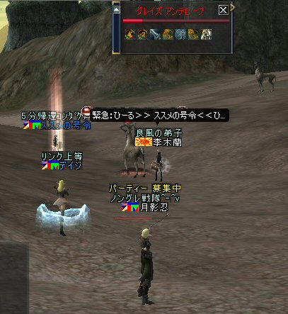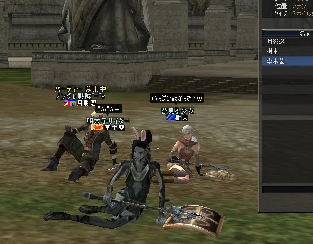 たしかにあった…。 告示しているにも関わらず…誰も来ない日が。 ソロか?ソロなのか!?ついにソロでイベントしなければならない日が来たのか@@; いつものメンバーもINしていないw あうぅ ;w; 叫んでも反応なしw 先週の賑わいがうそのようだ;w; 場所的な問題もあるのかもしれない…ギランの方が人は多い。 『!ノングレードで行こう!参加者募集中!!』 叫びが空しくアデンに響き渡る…。 ま、いいさ。 だからと言って、止めるつもりもないw ソロならソロで、楽しみ方はあるw で、コルマンのクエを始めた…。 するとwisが… 参加希望者だw ソロは無くなった。 良かった… つwT; そして蘭さんも合流。 シーレンで、しばし、ドム狩りをしたが、3人いるとこの辺は楽勝。 (時々リンクして危ないけど、足止め魔法があれば何とか処理できる) で、PTモンスターのいるサイレントバレーへ。 PTモンスターにチャーム作戦で挑む! (知らない人は、ずーっと前の記事を調べてねw) ススメさんも遅刻して参加w 最終的に、5人でPTモンスター狩りを堪能した^^v 最後やノングレ帰還。 皆さんお疲れ様でした^^w |