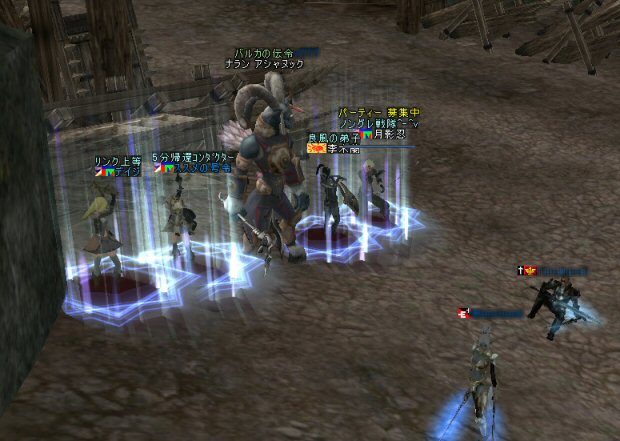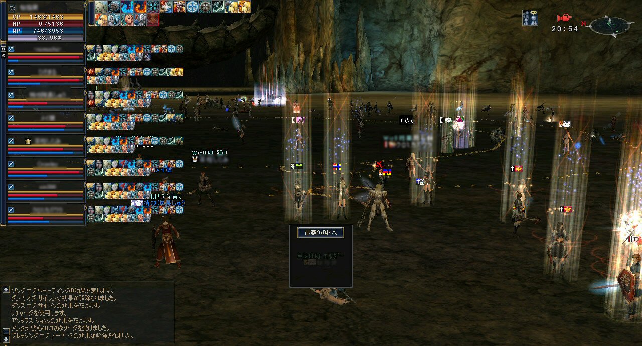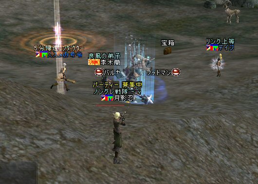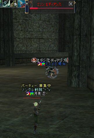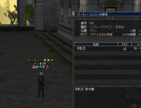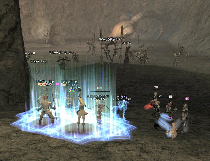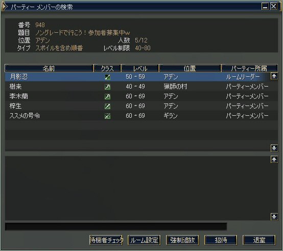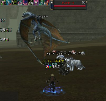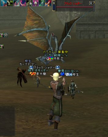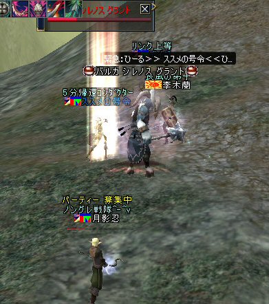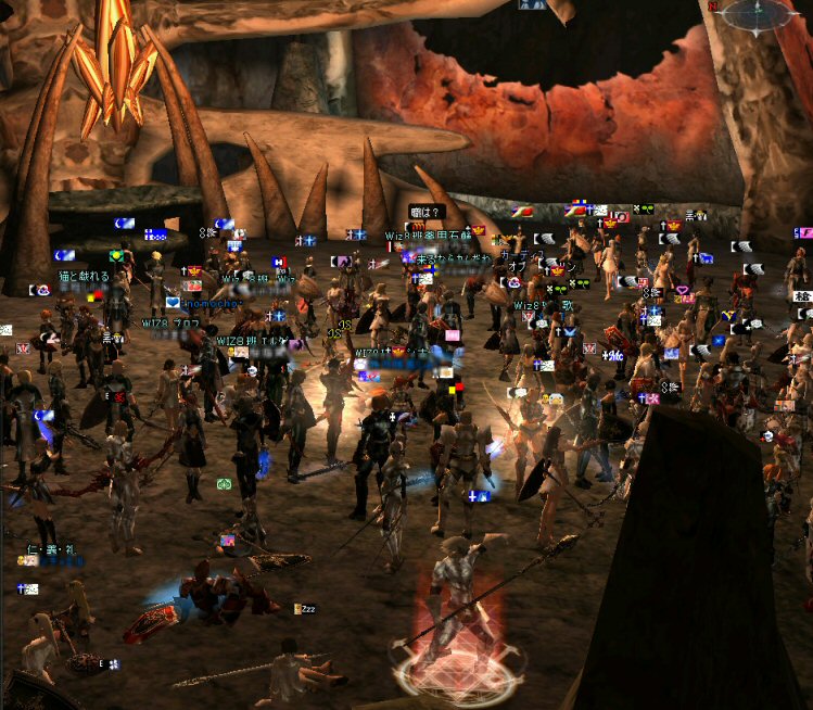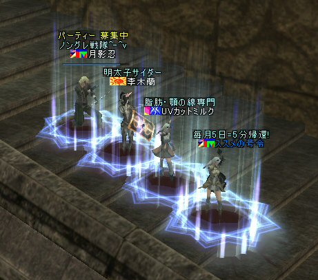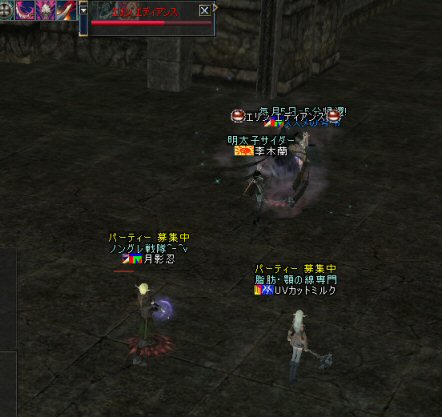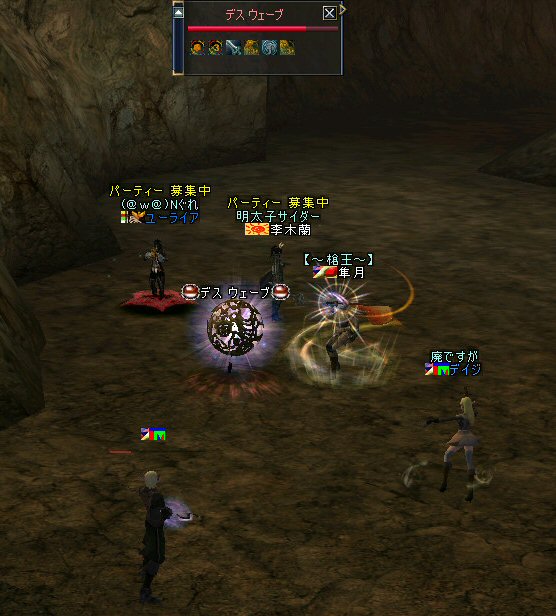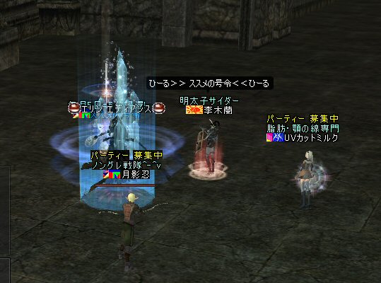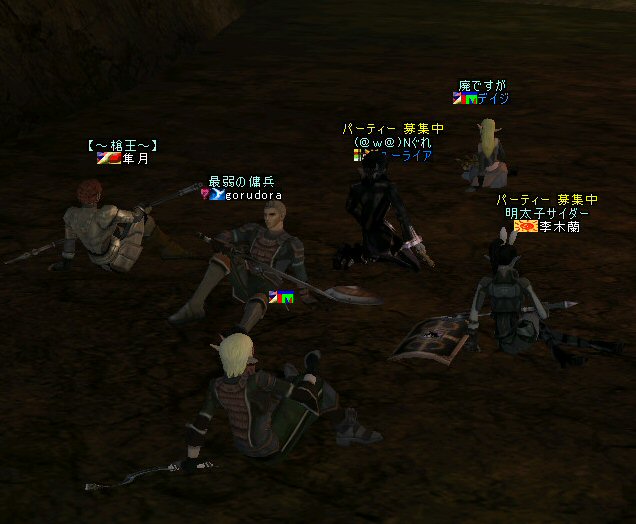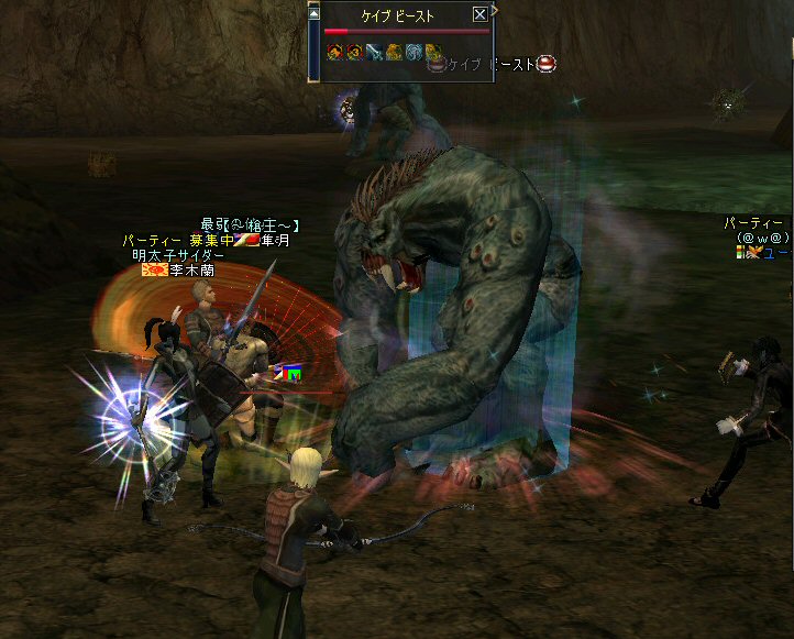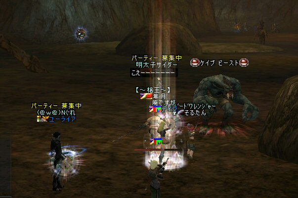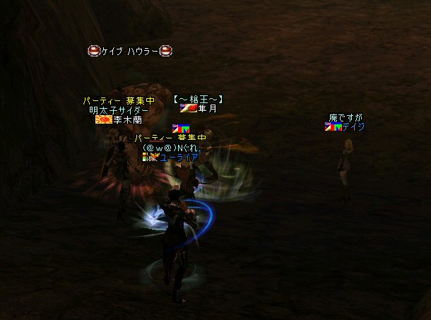 マスターがPCの電源を立ち上げた時点で21:10位だったと思う。 マスターが主催を始めて、初めての遅刻だ。 プレイマスター「定刻に集まって頂いたみなさん、ごめんなさい」 アデンの中央広場では、すでに蘭さん他、参加希望者が数人。 前の日に告示したせいか…? 今日は人が多い^^v しかし、ススメさんの姿が無い。 蘭さん曰く、台風の影響らしい。 今年は特に、九州方面に台風が集中して大変な事になっている。 リアルが大変なときに、「リネージュⅡ」をやってはいけないw ススメさん、大丈夫だろうか・・・ さて、集まったメンバーでどこへ行こうかという話だが・・・ 今回は、人も多いがレベル帯も40代からの参加がいる。 初参加も多い、かつ、 「GK代が高い>w<;」 と、ギランで立ち往生している参加者もいるし・・・と言う事で、 DVCへ行く事にした。 思い返せば、第一回目の「ノングレード装備で逝ってみよう!」は、DVCだった。 公式ページのイベント告知でも書いたが、 ============================================================================ 高いレベルの人で、ノングレード装備でどれくらいの狩場までいけるか? ノングレードの装備者でPTを組んで、いろんな狩場を狩り回ってみようというだけのイベントです。 自分の装備できる最上位グレードの装備を身に付け、OEし、経験値やドロップを追い求めて、狩りをするのも楽しみ方のひとつ・・・ま、これは良く見かけるプレイスタイル。 いい防具にいい武器なんて、接続時間が限られている人は、接続時間の長い人にはどうあがいたって、かなわんよなぁ・・・商才でもありゃ別かもしれないが・・・ でも、楽しみかたは、ひとつじゃないと思う。 OEできない装備を使い、己のレベルとプレイスキルのすべてを駆使してハイレベルな狩に挑戦してみよう! 経験値、SPとも激マズ。赤字必須。スリル満点、いつでも逝きそう(;´Д`) w。 ~略~ 1年以上前のノングレ告知 な・・・懐かしい(・・・のは俺だけか^^;) 仕様の変更に伴い、死亡ドロップが無くなったり変化は多少あるものの、 やってる事は今も、あまり変わらない。 当時は、ノングレの可能性が未知数だった。 いったいどこまでいけるのか? すぐにも逝きそうな「ノングレ」のイメージ。 「同レベルや高レベルのMOBには歯が立たないのではないか?」と言う不安。 新しいこと、未知なる領域へのチャレンジには、不安と期待がてんこ盛りだ。 PTで最強装備を身に付け、力押しでモンスターを倒すプレイスタイルでは味わえない、魅力がある。 今だから、このあたりでこの火力なら大丈夫とか、ここは危険とか、感覚で見えてくるものも、培ってきた成果と言えるだろう。 ============================================================================ そう、やっている事は1年前と変わらない。 でも、一年前とは感覚が違うのは確かだ。 そして、 ノングレ戦隊に不遇職は存在しないw よろしく (^ー^)b これも最初から変わらないコンセプトw 今回、職としては始めてのWL(ウォーロード:槍職)の参加が^^v 参加者が集まるまでDVC入り口で少し狩りをした。 俺のレベル(50代中盤)で適正くらい。 入り口で小手調べで、フィールドのモンスターを倒して火力の確認。 感覚ではあるが、火力的には、いつもより少し低いかもしれない。 もっとも、いつものメンバーだけで来た場合より火力が高いのは確かだ。 さて、今回はどこまで行けるだろうか? DVC入り口あたりのモンスターを倒せないと、当然先には進めない。 「倒せる!」 しかし・・・・硬いw 火力が足りないかもしれない。 みな、それぞれのスキルを使い、ノングレードの感覚を覚えていく。 特筆すべきはWL職のスキルの、サンダー ストーム(範囲スタン)だろう。 敵の多い少ないに関わらず、ノングレード装備で闘っている以上、攻撃を受けた場合のダメージは大きい。 ヒールのタイミングもMPの兼ね合いも有る。 シルレンのスタンショットは単体にしか発動できないし、失敗も多々有る。 そんな、PTの危機的状況で、このスキルはありがたい。 PTメンバーが何度かこれで助かっている。 途中、gorudora さんが抜け、 かわりに そるたん さんが参加。 レイドボス化したモンスターを倒し・・・。 前回も、その前も、プラントとかに阻まれていけなかったその先に・・・。 そこで目にしたものは、今の火力では到底進む事の出来ない世界。 普通ノングレでここまで来ないってw そういう意味では、ノングレPTのメンバーはすごいと思う。 自分で言うのもなんだが、『俺達って、クールだぜw』 という事で、参加した皆さん、お疲れ様でした^^ノ