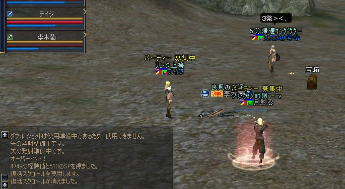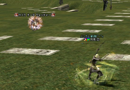 >時間は本日21:00~ >集合場所:アデン中央広場 >PTMも立てますが、フルPTになり次第募集は〆ます。 >場所は集まったメンバーで決めます。 >ちなみに前回は、傲慢の塔で全滅の危機に瀕してましたw >(ブログ参照) >自分で言うのもなんだけど・・・ノングレは奥が深いw ・・・のか? と公式には出していたのだが… いつものメンバーにクランメンバーが1名が加わった計4人PTにw デイジさんは70超えている魔法職。火力は高い。 60を超えたいつものメンバー二人。 そして、56の俺w 火力は…いつも通り。 さすがに70超えてのデスペナは怖いよね? 姉貴が苦労しているのを見ると、 70超えてノングレに出ようと思うだけでもすごい事なんだよなぁ…と思う。 さて、いつも1PT以内で済んでしまうイベントって、 イベントと呼べるんだろうか?と思う今日この頃ではあるが、 まあ、とどのつまりは部活だし。 おいしい狩場とかたくさんある中で、 わざわざマゾい遊び方しなくても…って皆思ってるかもね。 ただし、装備に依存しない生存スキルを身に付ける事は、 本装備で狩場に出かけたときに必ずプラスになる。 と言うことで、 「バルカ シレノス 駐屯地」へ。 ここは、ノーブレスの人が対象の狩場らしい。 火力の高いモンスターがいっぱいいる。 普通なら来ない狩場だ。 なぜなら、俺のレベルだと、攻撃が当たりにくいのだ。 しかし、70レベルの人が、60くらいのモンスター相手じゃつまらないだろう。 やはり、高レベル者に合わせよう…と思った。 多分、大丈夫。感覚的に「行ける」感じがする。 (70台がいなくても、ルーツが決まって、俺と同じレベルの弓職が3人いれば、多分なんとかなる) 己が「理力(フォース)」を信じよう。 ここでの俺の通常攻撃は、外れる事が多い。 しかし、当たる事も結構有る。 56とは言え、多少なりとも火力にはなっている。 スキル攻撃の「ダブルショット」とか「スタンショット」は、かなりPTに貢献している。 特に「スタンショット」は、PTメンバーの命に関わる時に発動し、 かなりの高確率で決まった。 肝は、『ルーツ』 これが決まれば、何とかなる。 で、真っ赤な敵相手に、蘭さんが『ルーツ』を決めてしまうw (もちろん祝SPSは使っている) 足止めが決まらないと、全滅コースではあるが・・・。 ↑宝箱に食べられた俺の図 ↑モンスターに食べられた蘭さんの図。 ただでさえ、危険な狩場だというのに、平気で叩きに行ってしまう蘭さん^^; 本人曰く、「楽しければOK」 なかなかの、兵(つわもの)である・・・^^; ほとんど火力はデイジさんだよりでは有るが、それにしても、ノングレード装備である。 はっきり言って、「TUEEEEEEEEEE!!」@@; 終盤で、リンクしてちょいとお祭りになったが、このときは全員生き延びた。 MPの少ない中、MPを工面し、 ルーツ、スリープ、ヒール、スタンショット、みんなの持ってるスキルを総動員した結果だ。 運もよかったと思うが、『生き延びた』事実が、俺達の勝利の証。 この達成感はなかなかのものである^^ 装備も大切な要素では有るが、遊びのどこに価値観を見出すかは、大切なポイント。 効率は確かに落ちるが、狩れない訳ではない。 適正装備のSやらAやらBやらの装備の、普通のPTを前にしてノングレード帰還w 「目立ってる、目立ってる^^v」 という事で、危険度の高い『バルカシレノス駐屯地編』でしたw 参加した皆さん、お疲れ様でした^^ノ