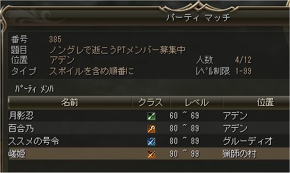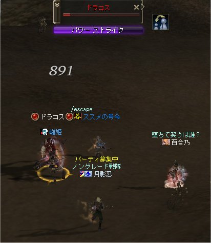先週は、参加者4人で傲慢の塔を堪能した。 80台ばかりで、初期職ドワーヴンファイターの80超えはもはや伝説級だろう。 面白いプレイヤーが集まるのが楽しいし、うれしくもある。 リネージュⅡの魅力の一つだ。 だが、仕様変更について言えば、 毎回、ノングレード戦隊の価値観をすべて否定するようなアップばかりなのが 残念でならない。 今回は、フォーメーションを組んで魔方陣の変化を楽しみながら帰還する「5分帰還」が、 とても悲しい事になっていた。 orz (魔方陣が5分かからず消滅する;w;5分帰還を返せ~ >w<;)。。。 製作側に文句を言いたいが、価値観が違うんだろうな・・・。 ま、無料期間が終わるまで、みんなと楽しもうと思う。宜しく。 開催日:2012年5月17日(木) 集合場所:アデン中央広場 集合時間:21:00集合 作戦時間:約2時間の予定 作戦内容: ノングレード装備による冒険。どこへ行くかは未定。 集まった人で、場所については決めて行こう。 参加資格: 全身ノングレード装備(裸装備もOK)(OE品は禁止) ペットも参戦OKだが、死んだ場合の蘇生準備は自己責任で。 レベル制限無し。職の制限も無し。好きな職で。もちろん血盟や同盟も関係なし。 (経験値は期待するな。特に60台の俺は絶望的かもw 80台多いしw orz) ただし、血盟戦中の方はご遠慮ください(遊び方が違うのでごめんね^^;)。 あと、死んでも「祭りだw」と笑って済ませられる人。 復活は原則、最寄るかノーマルスクとなります(蘇生できる人が参加してくれるとありがたい)w 晒されてもかまわないキャラクターでw 効率無視の冒険PTなので、冒険者バフは特に無くても構わない。 補助の出来る人が参加してくれたらラッキー。最悪、補助が無くても何とかなるw 基本、あるもので賄うのがノングレスピリッツw サークルメンバーは…できれば参加おねがい! その他: 回復スクロールとか、POT類、復活スクロールも出来たら準備を。 危ないところに行くときは復活スクロールがあると、かなり助かる。 ま、ノングレード戦隊に興味があるなら参加を^^; では、現地で会おう(^-^)ノ