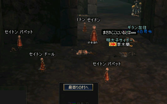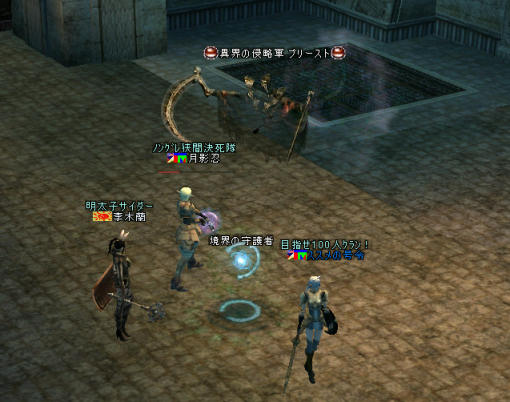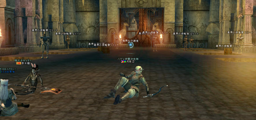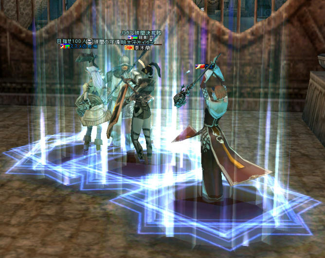 「俺たちはまだ、狭間に行った事が無い。なので狭間へ行ってみよう!」 そんな話があって、急遽行くことにした。 今日は(も?)少数精鋭のメンバーだ。 (ってかもう少し参加者増やさんとな… ^^;) ミッション:『狭間から生還せよ!』 俺たちは、生きのびる事ができるか@@!? まあ、火力は無いので様子見。一番弱いところから体験してみよう…。 対象が30代の狩り場なので、当然敵は真っ青。 しかし、経験値はそこそこ入ってくる。 まあ、ぬるいと言えばぬるいのだが… 最初の部屋から、部屋を重ねるほどに、だんだん強くなってきているような…^^; うはw メイジに燃やされるw 休憩していると、わらわらわいてくる。 なんとか、無事に30代のミッションは終了できた。 さて次は… 40代… やっぱり、火力足りないわw 開始早々にススメさんがEND 撤退を選択した… と言う訳で、ノングレ帰還で今回のミッションは終了。 (ノングレ帰還しても、控え部屋から出られないらしい… ^^;) (なぜか、帰還だけ飛び入りの人が…) お疲れ様でした。 終えてみては、バランスの整ったPTで、人数さえ揃えば40代も結構面白いかもしれない。危機感は高い。50代、60代は…ある種壁のような気もする。(た…試してみたい…) |