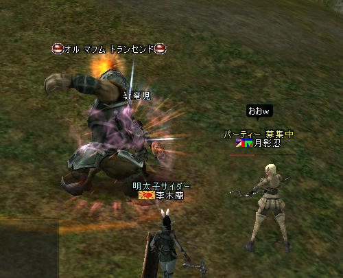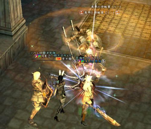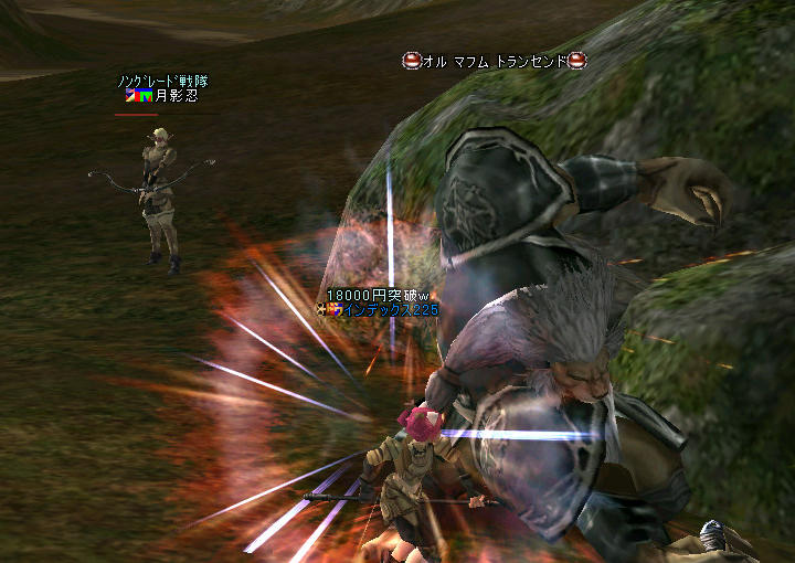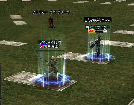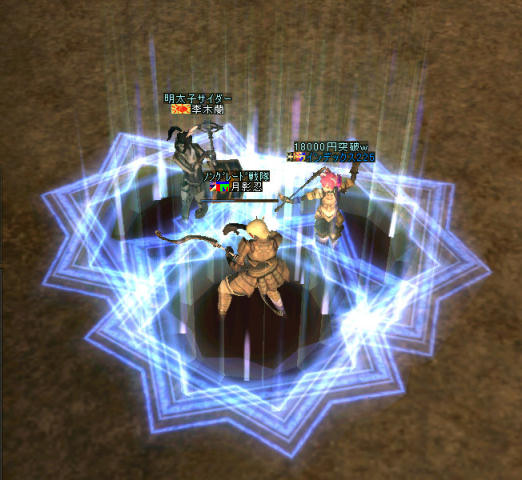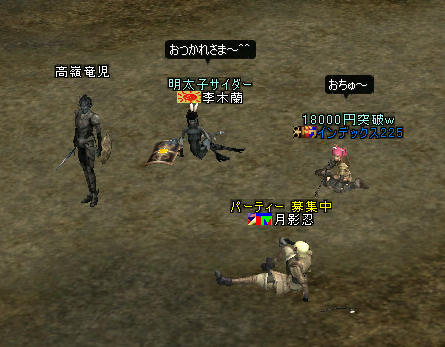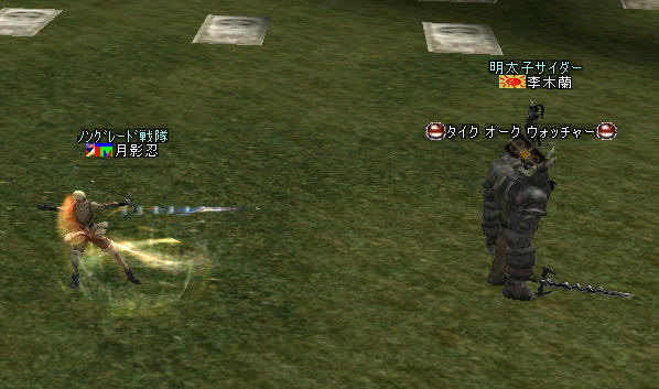 メインのメンバーであるススメ氏が、個人的理由からサークル活動自粛を宣言。 そして…だれも来ない;w; やばい。サークル活動になって、ソロは無いだろと思っていたが… それでもソロの危険があるのかw ^^; まあ、ソロならソロでいいけどね… orz 『ノングレードで逝こう!』は、 もともとは、装備差別が存在するらしいこのゲーム世界の中で、 上等装備だけがチヤホヤされて、それ以外の装備だと遊ぶのにも引け目を感じるような風潮に一石を投じたくて始めたものだ。ゲーム時間の短い人には絶対的に不利な廃人仕様ゲームに、『廃人仕様の遊び方』以外の楽しさを見つけたい…そんな、ささやかな抵抗とも言えるだろう。 本来、ゲームは楽しむもの。 レベルも職も、装備も関係なしで遊べる仲間や環境が欲しい。 全装備が無くなったとしても1ヶ月あればノングレード装備ならば揃えられるだろう。 (実験の日々参照) そうだ!装備で手ごろの手に入るのはノングレードしかない! そんな所からノングレードで逝こう!は始まっている。 今まで、自分達よりレベルの遥か上の赤い敵を討伐して、ノングレード装備での戦闘限界を見極めるようなやり方をしてきた。フルSSでの戦闘。経験値は悪くないのだが、死亡する可能性も高い。スリルを楽しむ方法としては良いと思う。しかし、消費するSS代やら弓矢代、交通費を考えると赤字になってしまう事が多い。 ここらで、少し原点に返ってみよう。 ノングレードでの通常PTで、利益は出るのか? いや、出すにはどうしたらいいのか? と言った視点から、今回はやってみる。 SSを使わない事を前提として、狩り場を選定した。 参加人数3名。 (ソロでなくて良かったT-T;) 緑色~白のモンスターが生息する狩場へ。 リンクも時々発生するのだが、いつもと比べたら段違いに楽だ。 (MPが枯渇するのはそんなに変わらない^^;) 本装備に比べれば、殲滅スピードは遅い。 しかし、ノングレードでも狩れている。 それもNSSを使わずにだ。 消耗コストは弓矢代だけ(時々体力回復POT^^;)。 アデナのドロップもある。 こ、これは黒字だw 俺からすると白や緑だが、他のメンバーからすると、薄青だったりするかもしれない。 変身モンスターも討伐した。 インデックスさんも途中から参加^^ 火力のアップによる殲滅スピードの増加と、スポによる素材が懐に入るようになった^^ 10時半を回った頃、竜児氏が帰還。 PT構成は変わっても、狩りは続けられた。 11:00頃、ミッション終了。 みなさんお疲れ様でした。 終了してみて、利益が20K位出ていた(素材除く)。 火力は必要だが、ノングレードで利益の出るPTは可能だと言えるだろう。