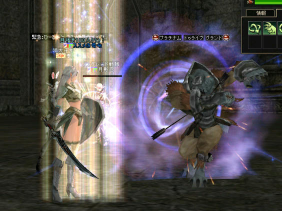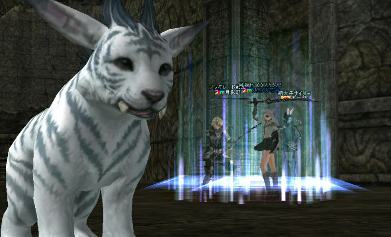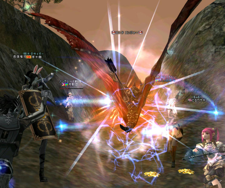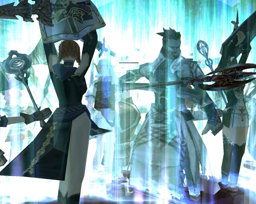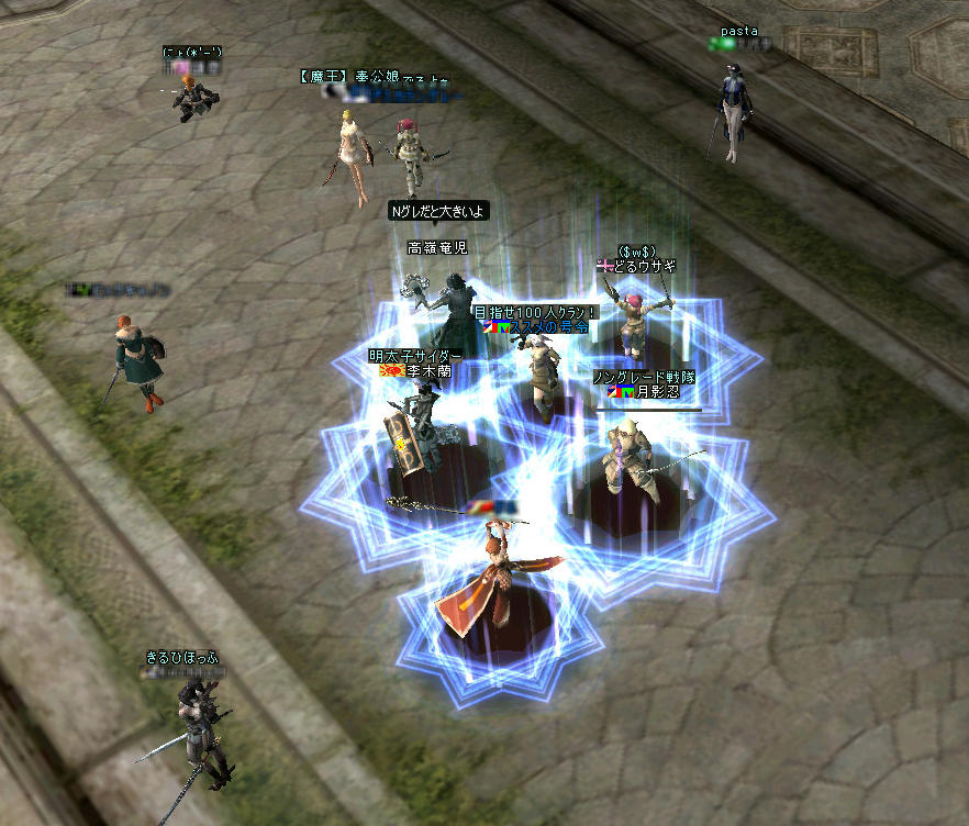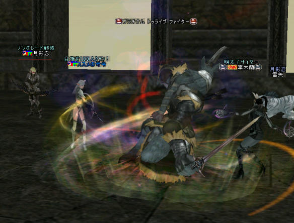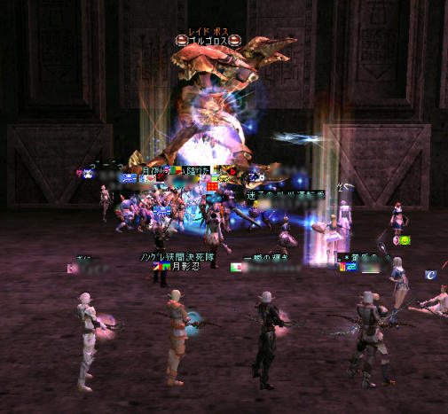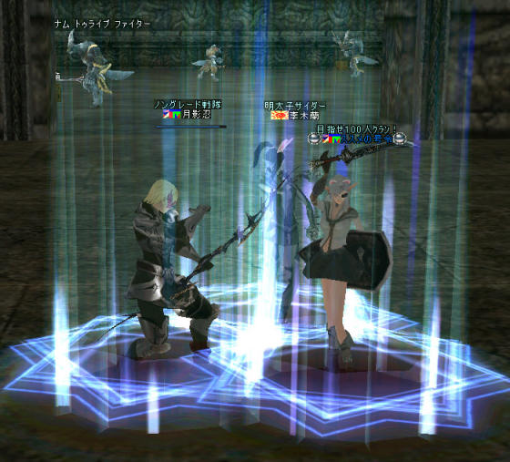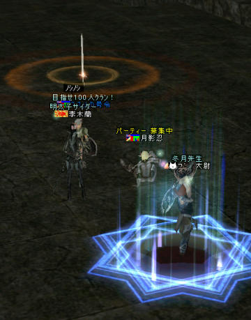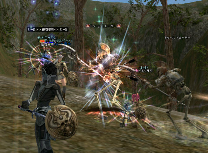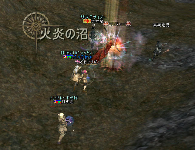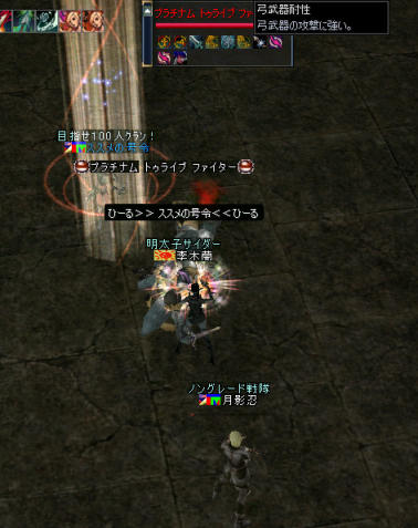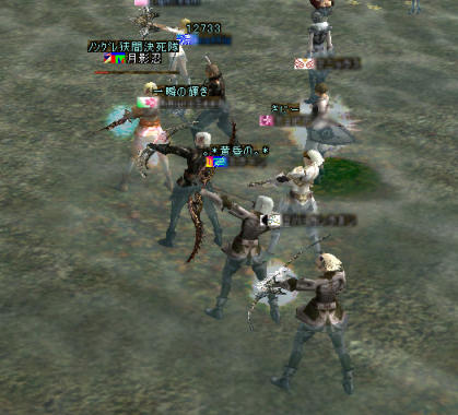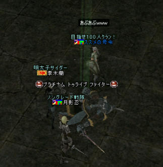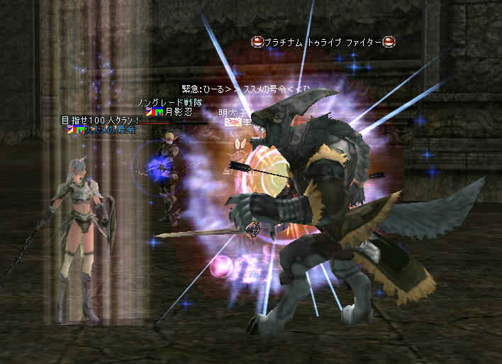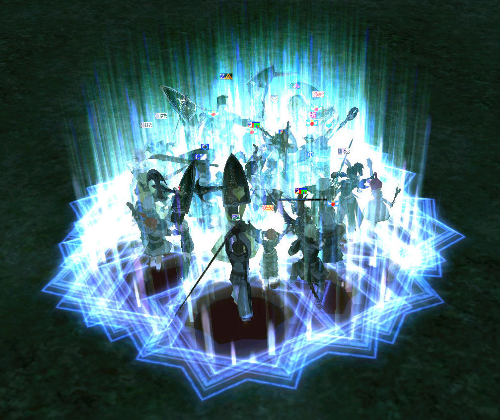 今回はいつものメンバーが揃っている。 ススメの号令 高嶺竜児 どるウサギ 李木蘭 それに俺の5人のメンバーだ。 さて、どこへ行くかだが、毎回の事とはいえ悩み所だ。 今回はドゥームナイトの生息する地帯で狩りをしてみようと言う事に。 50代がほとんどのPTなので、適正かもしれない。 (とは言っても、真っ赤なんだよね~^^;) アデンから、GKで火炎に飛ぶ。 参加メンバーの集合待ちで、少し時間が出来た。 もったいないので早速近くにいたコンジャーファミリーと戦闘。 当然真っ赤だw 普通なら、火力が無いとかなり厳しい戦いになるのだが、 ここでも「チャーム作戦」を実行。 1.チャームで単体を引き、殲滅。 2.単体殲滅で襲われている事に気付いたコンジャー小隊をルーツで固定し、各個撃破。 まあ、最初からルーツでも行けるかも知れないが、 ノングレードの道を選んだ我々としては、 同時に倒す敵は少ないほうが有利なのは言うまでもあるまい。 コンジャーファミリーは結構楽しめた^^ さて、レイドボスのタイフォンが生息するあたりでドゥームナイトとの戦闘である。 このあたりで、アクティブなモンスターは『ドゥームナイト』なのだが、 ドゥームナイトの周りにいる「ドゥームトルーパー」や「ドゥームウォーリア」が、リンクしてくる。 適度に離れた所で戦闘しないと、わらわら寄って来て、危険だ。 おまけに「ドゥームナイト」のスタン攻撃を受けると、危険状態から危篤状態に変わるw 「ドゥームトルーパー」は槍だから近接戦闘職は複数でダメージを負う事になる。 スタン中は、牛乳(体力回復剤の一種)も飲めない。 ヒーラーが一人で複数の面倒を見る事は困難だ。 ただでさえ、ルーツとヒールでMP消費量が多いのだ。 …そして全滅;w; ↑最寄ったところ とりあえず、俺が最寄り、救出活動をする事にする。 現地について、モンスターがいっぱいたむろしているのを見て、困難が予想された。 「どうする?俺w」 そのとき、横からモンスターを引いてくれる人が居た。 すかさず蘭さんを救出。 しかし…引いてくれた人が、複数のナイトに襲われている…スタンも時々入ってる… 「これはヤバイかも…」と思い、自分の危機的状況は置いといて攻撃! ↑襲われている所 …しかし、間に合わなかった;w; 横たわるその人を救出しようと蘭さんが移動。 しかし、最寄ってしまった後だった。 その後、アクティブなナイトに襲われ、蘭さんも俺も逝ってしまった;w; うーん、救出作戦失敗。 リトライしようとしたが、みんな最寄ってアデンへ。 救出作戦失敗のまま終了… orz 仕方ないのでアデンでノングレ帰還を… (意味がないといえばそれまでだが…^^;) しかし、なぜか周りの人に受けて、飛び入り参加まで出る始末w 本日のノングレ活動終了です^^; お疲れ様でした。 番外編: ノングレの後、何を思ったかススメさん… 突発イベント「100人/escape」を主催していたw (俺も参加した^・^)v ギランの決闘場に集合。時間をあわせて参加者みんなで「/escape」 時々PVPもあったが… 冬の夜空に、 熱い心の「光の輪」がつながった瞬間だ^^