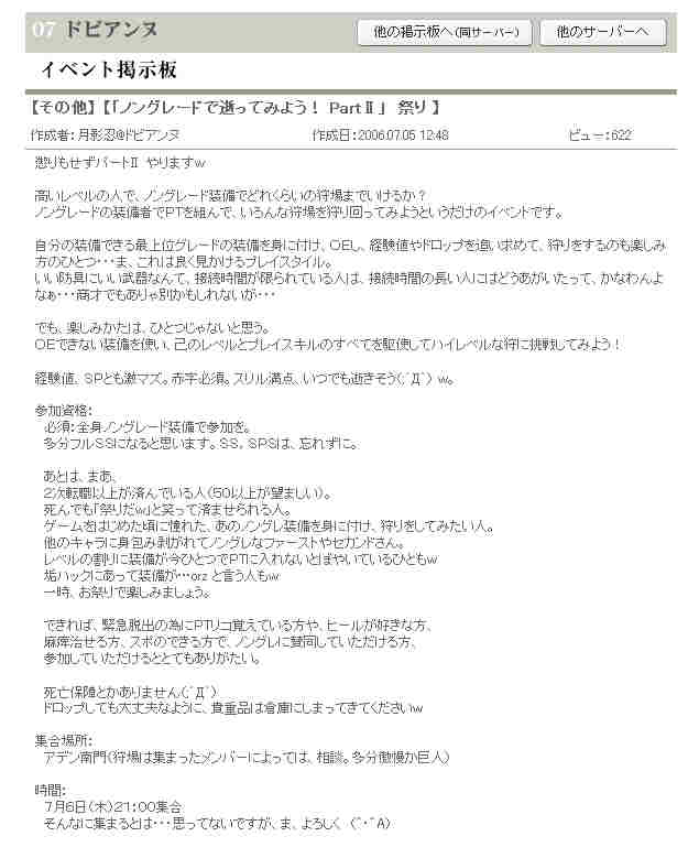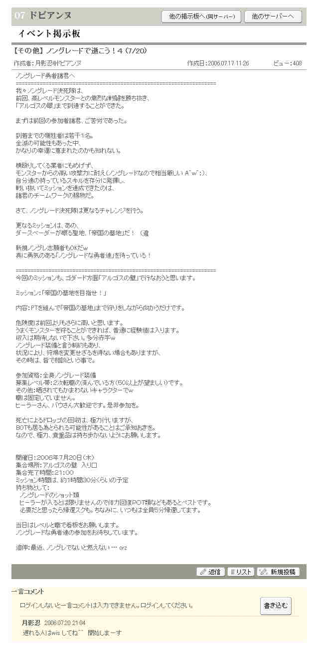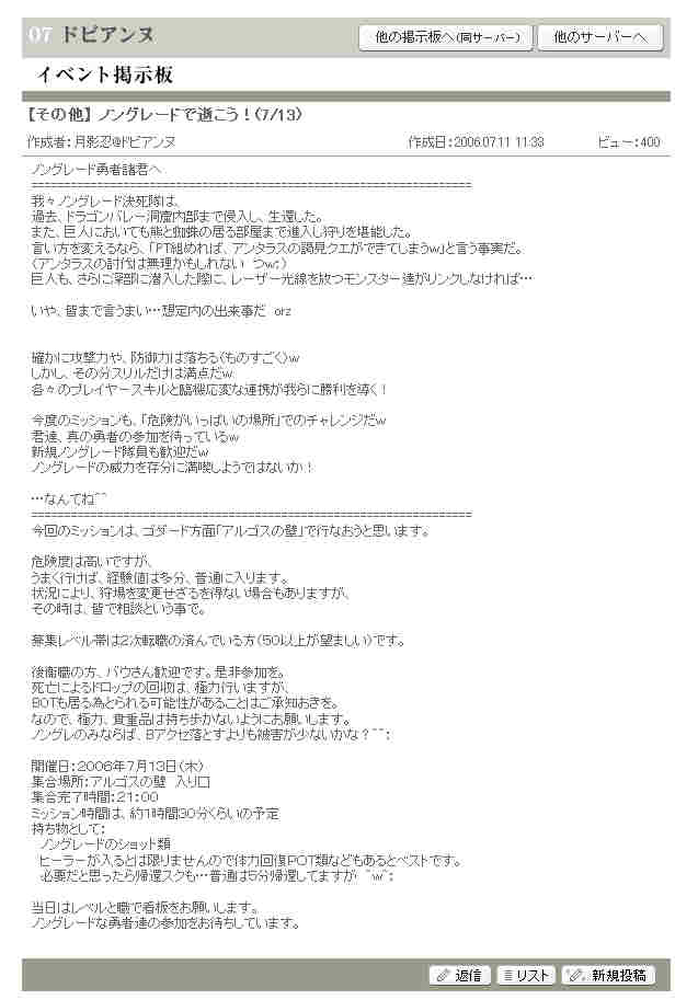 作成者:月影忍@ドビアンヌ 作成日:2006.07.24 18:13 ビュー:381 ノングレード勇者諸君へ =================================================================== (声:月影忍の影の上司) 前回のノングレード決死隊の参加者諸君。ミッション達成おめでとう。 今回の報告書の内容を見る限り、君達は、通常ではありえない自分達とレベル差10~20以上もあるモンスター達と戦い、勝利している。 それもオーバーエンチャットなど不可能な通常兵器や装備でだ。 あえてどこでも入手可能な装備で、危険度の非常に高いミッションを成し遂げたその功績は賞賛に価する。 通常の狩りを行うのをやめ、 あえて困難なミッションに挑み、 それを達成する為に奮闘、生還した君達ノングレード隊員に敬意を表す。 君達こそ、死をも恐れない真の勇者だ。 さて、次のミッションだが、次はあの「傲慢の塔」だ。 ミッション:「業者の塔を登れ!」 (ぇ 次回のミッションを遂行するに当たり、リアルの都合がつき、かつ、真の勇者として自覚あるものは是非参加して頂きたい。 常連として参加してくれる諸君らの他に、我こそは究極のノングレード戦士と自負する新規志願者も募集する。 なお、ミッションに参加した諸君らが途中死亡したり、行方不明になったとしても、 当局は一切感知しない。諸君らの健闘を祈る。 なお、このスレッドは自動的に消滅する。 (この投稿は管理者により削除されました。(;´Д`) ・・・なんてね^^; =================================================================== 高いレベルの人で、ノングレード装備でどれくらいの狩場までいけるか? ノングレードの装備者でPTを組んで、 いろんな狩場を狩り回ってみようというイベントです。 今回は傲慢の塔の予定です。 障害物が多数存在し、リンクするモンスターも多数。おまけに魔法攻撃も… 危険度は毎度の事、高いです。おまけに、魔法攻撃は痛いです ><; 恐らく引き狩りがメインとなると思いますが、己が知力と体力、魔力を駆使して、 果たして、ノングレードでどのあたりまで上れるものでしょうか? ミッション:「業者の塔を登れ!」 開催日:2006年7月27日(木) 集合場所:アデン英雄の記念塔前(中央広場) 集合時間:21:00~21:20 作戦時間(行き当たりばったりですがw)は、約1時間30分くらいの予定 参加資格:全身ノングレード装着で2次転職を終えている方ならどなたでも (50以上が望ましいです)職は固定していません。 あと、死んでも「祭りだw」と笑って済ませられる人。 晒されてもかまわないキャラクターでw ヒーラーさん、バウさん大歓迎です。是非参加を。 ノングレードな勇者達の参加をお待ちしています。 =================================================================== と、告知して昨日ノングレードで行こう!5を開催した。 ドビアンヌのイベント掲示板に告知に告知してビュー:381・・・ 最初の頃は1,000を越えたんだが・・・ ある意味、見る人が決まってきているのかも知れない。 毎週やってるから、またか~のレベルかもw =================================================================== PR