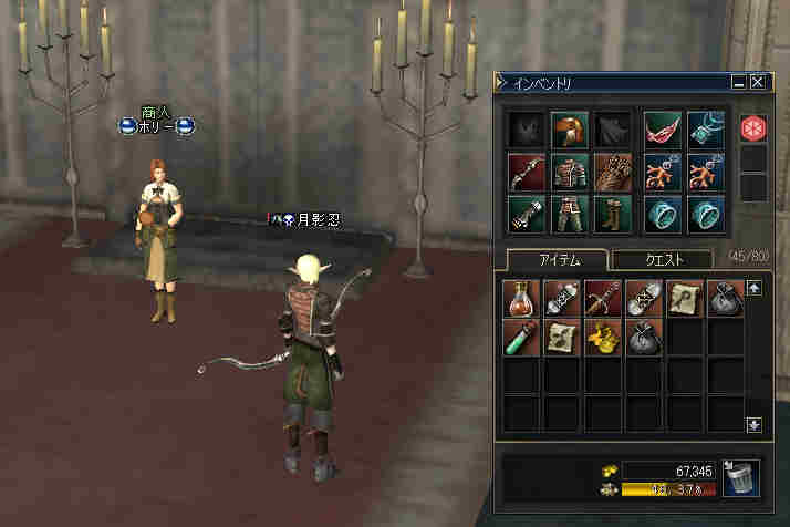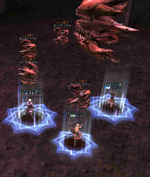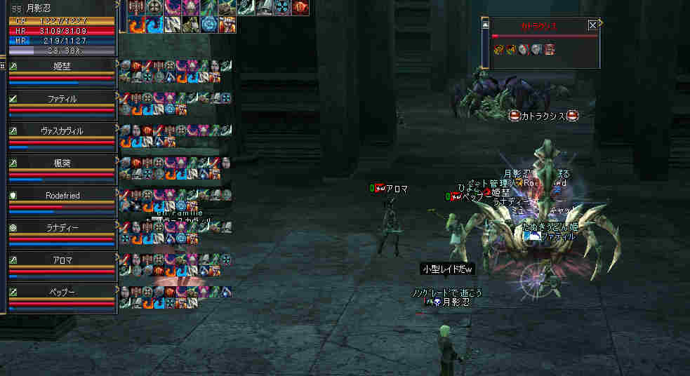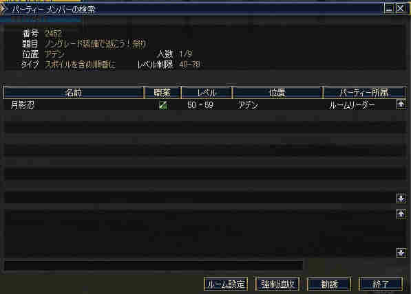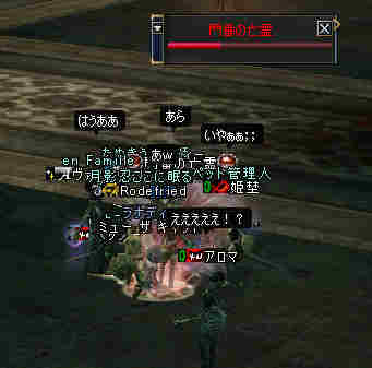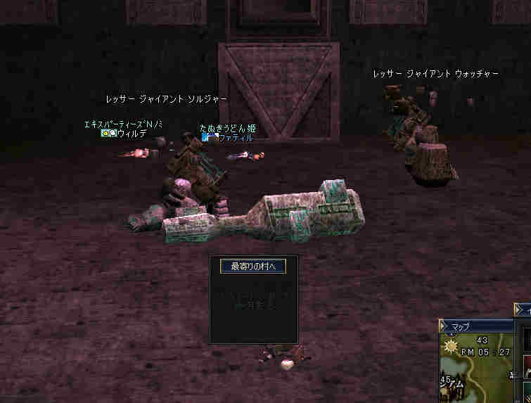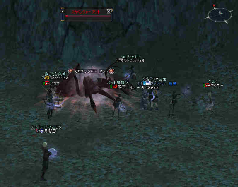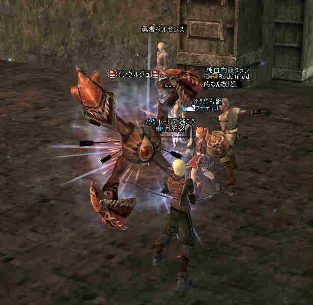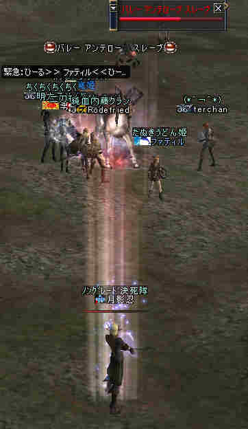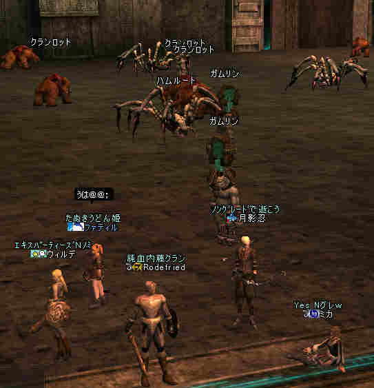 集合時間少し前… 20:50頃、PTマッチを出してみた… … … … 誰も来ない 21:00… まあ、寒い企画だし… 掲示板に載せても、誰も集まらない祭りなんて、恥ずかしいかもな… そう、先週が奇跡だったんだ。 うん、そうに違いない。 先週は、たまたま、すごいメンバーが集まったんだ… 今週はみんな忙しいとか…リアルで色々あったとか… 先週は、実は面白くなかったとか…(;´Д`) 結構、蚤の心臓だったりする… ソロか…w orz と、諦めかけた時にみんな集まってくれた… 助かった…OTL 巨人…浅瀬 ノングレードで十分いける場所だと思う。 PTMOBで、ちょっと強いのがいきなりわいたりして、ちょっとあせったりもしたが、 まあ、何とか撃退できる。俺のレベルでMOBのネームの色が白だから、適正と言えば適正である。 ちょいと奥へ進もうか… 熊と蜘蛛…あれ? アイテムが…ああ、「アンタラスの謁見」か! クエアイテムが揃ってしまった^^v ちょっと得した気分。しかし、好事魔多し… レッサー ジャイアント ウォッチャーやソルジャーがリンク… ノングレードで逝ってしまった…w ■今回は全滅です…orz アデンに最寄って、お祭りは終了。 PTメンバーで遺品が出たので、遺品回収ミッションに移行。 今度は普段の装備を整え、再度巨人へ突入。 遺品を落とした場所は、後でわかった事だがレイドが沸く部屋だった… そして5分帰還…(普通に帰還だったかな (@@;A) で、今回のミッション終了。 さすがに、いつもの武器だと殲滅が早い。 倍くらいの攻撃力になるし、襲われてもHPの減りが少ない。 当たり前のことではあるが、装備の有り難みがわかる。 しかし、ノングレード武器も侮ってはいけない。使ってみると分るが、結構使えますw そう、スリルを求めるのならば、ノングレは悪くない選択だと思う ^^v |