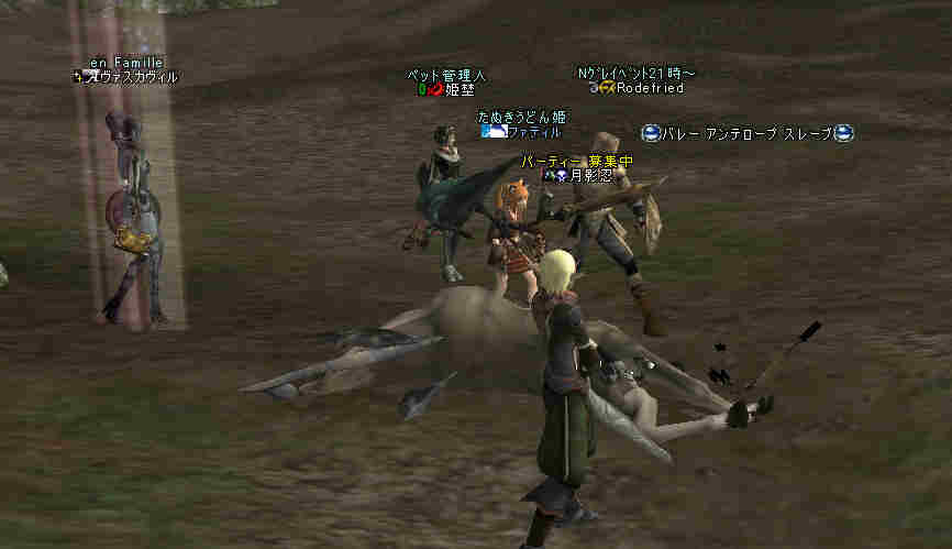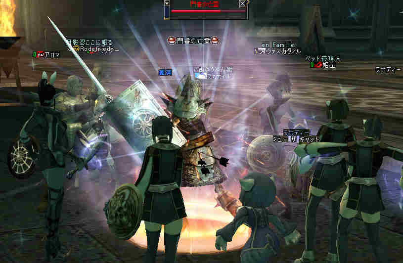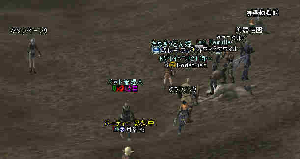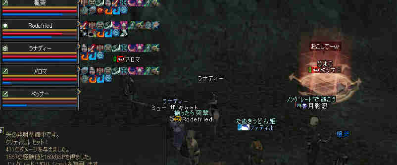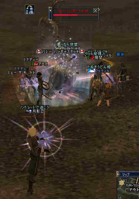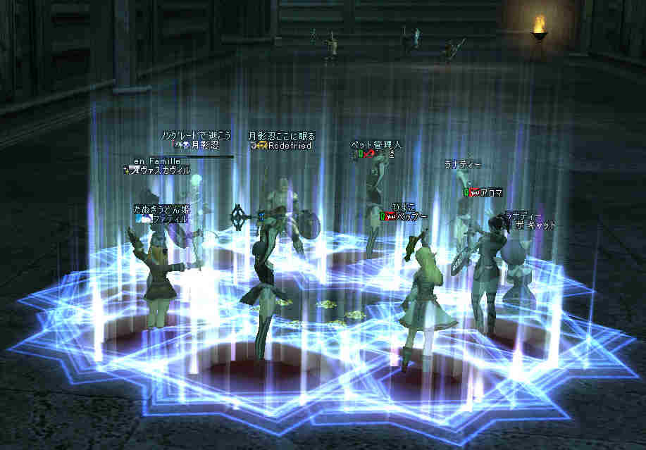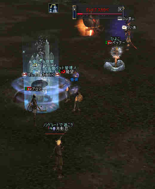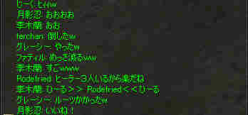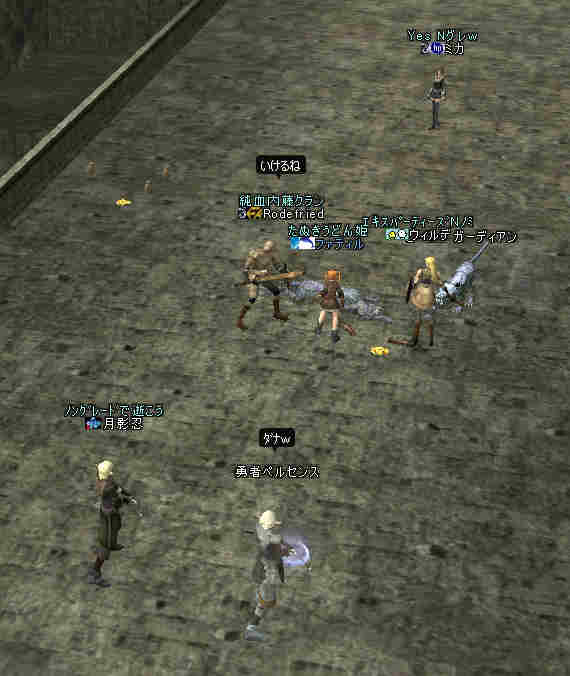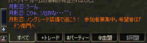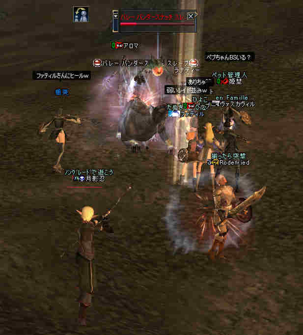 盟主が新鯖に引越しした為、自動的に解散になった。 まあ、思い出はいっぱいあるが、これも仕方の無い事… 新しい思い出を作る日々が、また始まる…。 と言う訳で、 姉貴が「Wyvern血盟」時代に一緒だった人の所にお世話になる事にした。 いわゆる姉貴のコネだなw ま、知る人ぞ知る、伝説のクランだw 当然旗も替わります^^v 入って驚いたのが、同盟チャットだw ものすごい勢いで流れていく。 人が多い証拠だ。 しかし… 血盟チャットは沈黙を守ったまま… 「血盟チャット静かだね」 「ほとんど使ってないからね」 @@; なんと、同盟チャットですべて用が足りてしまうw 血盟と同盟の敷居が無いw ある意味最強同盟かも知れない。 ま、話してる内容は下ネタ系が多い気がするが… (姉貴には見せられんな^^;) あと、PTを多少期待していた所が実はあったんだが、 大きく裏切られる事に! 「みんなソロが多いからね」 こんなに人数いるのに…うーん ソロは嫌いだ・・・w