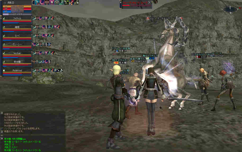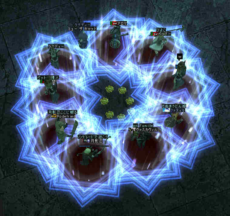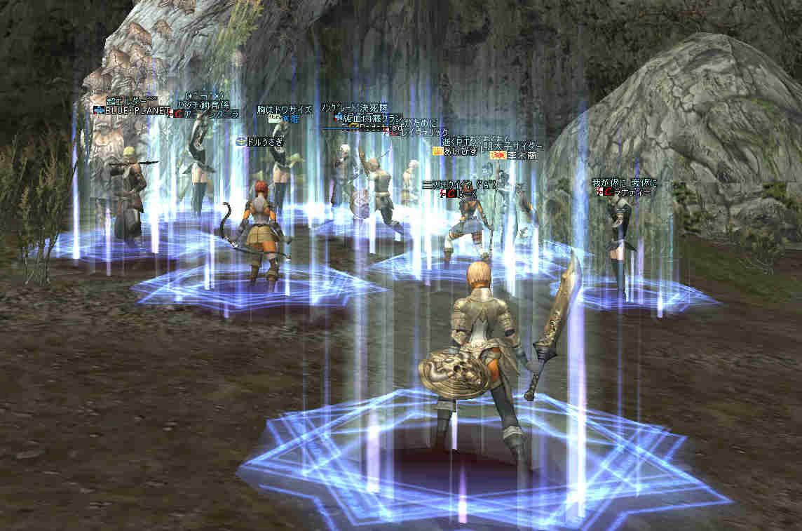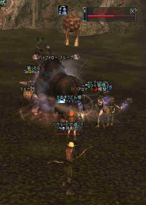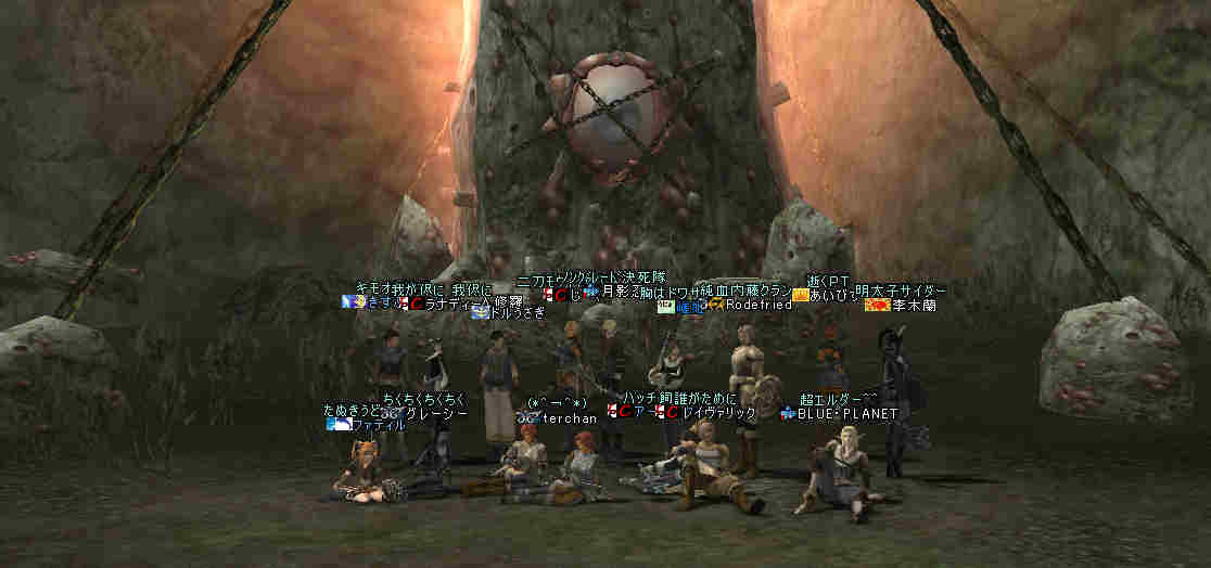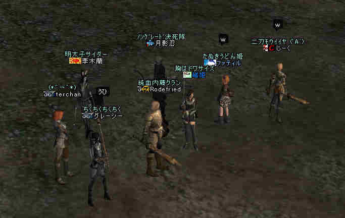 2006年7月13日(木) 21:00~22:30 ミッション:アルゴスの眼を探せ! 20:55頃、現地に到着。 すでに志願者が何名か集まっている。 特記すべきは一番乗りを名乗る志願者が2人。 「一番乗り」が「ふたり」って、「一番」の意味って一体なんだ@@; いや、ノングレード決死隊では、この「乗り」が大事だw 21:00過ぎに編成を開始…と言っても、1PT分の人数9人しか居ない。 普通なら、この状態で「みwwなww(中略)ぜww」で出発する所だが… 今回は、いつもと状況違う・・・ 参加希望者から連絡(Wis)が入るのだ… 「まだ間に合いますか?」とか「遅れます><;」とか… 社会人プレイヤーだと、 やはり通勤時間や残業等でどうしても遅くなりがちになる。 まして、緊急の仕事とか入った日には… 社会人は大変なのだ。 …と言うことは置いといて… 特筆すべき点はここにもある。 複数PTなんて、「ノングレードで逝こう!」始まって以来の快挙?@@;なのである。 主催を含む、古株メンバーで複数PTを体験したものは、いまだかつて居ない。 とりあえず、遅れて参加する志願兵がいる事をPT内に伝え、狩りを始める。 まずは、自分達の実力がどれくらいのものか? もちろん俺の目から見て真っ赤なMOBしか居ないw 「やってみなければ、わかるまい」 で、FAしてみる…当然タゲは俺に来るw さすがノングレード! 痛い!!(;´Д`) 3撃ぐらいで半分くらいHPが無くなっただろうか… ヒーラーが居てくれなければ、逝っていた…ありがとうヒール職のみんな(T-T;) また、後衛職も皆、いろいろな事を試す。 ルーツが結構決まる事が判明した! ルーツが決まると、狩りは格段に効率がアップする。 手探りで、色々な狩り方を模索するのも楽しさの一つだ。 確かにHPの削れるスピードは遅いが…相手の回復スピードよりも早い! なので、狩りが成立してしまうw スポも決まるw 1PTでも狩りは可能である。 ただし、ヒーラーは必須w さて、遅れてきたメンバーも徐々に集まってきたので入り口に一旦戻る。 再編成を行い2PTに。 「PTLやりたい人」 …シーン… 誰も居ないので、「ノングレードで逝こう!」皆勤賞の Rodefried 氏にお願いした。 さて、どうPTを分けようか…と、思案していると、 Rodefried 氏が看板をだした。 「逝くPTはこちら」(だったと思う) w みんなぞろぞろとそちらに… Rodefried 氏、両手どころか両足も花(ハーレム状態w) ww (おいおい、俺の方は@@;) 最終的には、バランスよく分かれた感じになったが…、 さすが死を恐れないノングレード勇者の集まりだw 心意気が違うぜw さて、PT分けだが、 PTLを立てて、その他のプレーヤーは、自分が選んだPTLの所に集まる。 自己責任で、自分のPTを決める。 ノングレード決死隊に相応しい方法だ。 なかなか使える方法だと思う。 そして、60を超えるMOBの中、ノングレード決死隊の冒険は続く・・・ 移動途中… 猛犬(スナッチ)も何とか倒したw 何か、とても硬かった気がするw 目玉のアクティブMOBに襲われ、魔法攻撃の直撃を受ける。 なんと8割くらいHPを持ってかれたw うはw 死むw 間違いなく死ぬw もう一撃受ければ逝っちまうw で、必死で逃げてたりする^^; ヒールしてもらってすかさず攻撃に参加w 戦死者がここで一人出たw ここは、予想通り(以上?)にとてもデンジャラスな場所だ…(;´Д`) リザ後、移動… そしていよいよ「アルゴスの眼」への坂道が見えてきたw 「この上だw」 みんな走って山頂へ… 「アルゴスの眼」発見w 誰も命令していないんだが… なぜかフルSS戦闘状態w(;´Д`) 現地到着:22:30 「ミッション終了!」 記念写真^^ 今回参加した、ノングレード勇者達の勇姿ですw みんな、ありがとう^^ そして… 恒例の5分帰還で幕を閉じた。 ミッション:アルゴスの眼を探せ! 完了!!