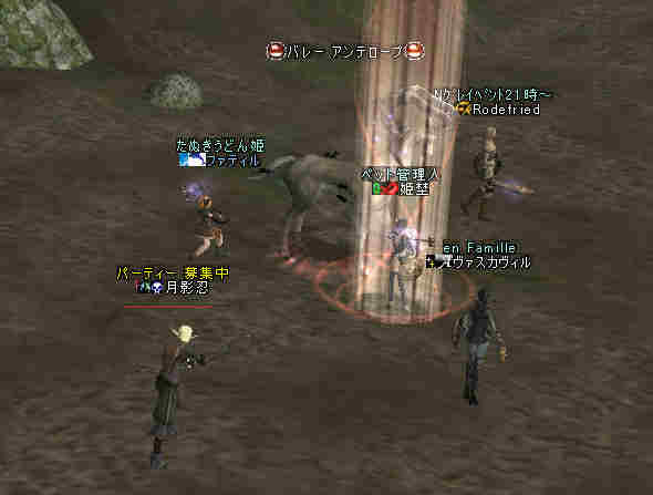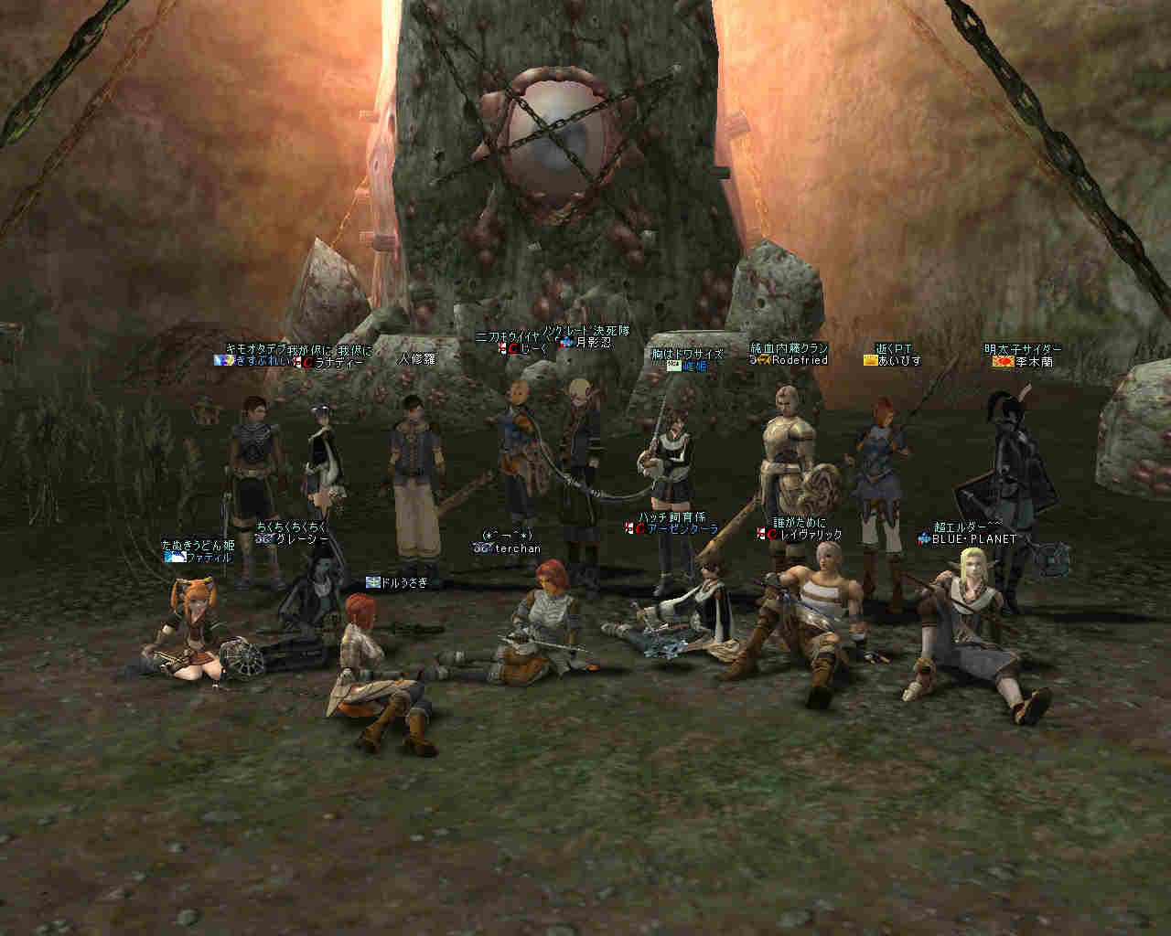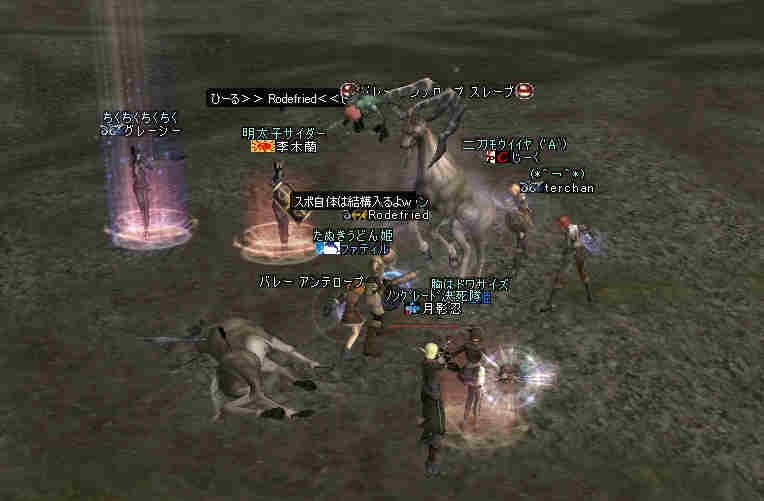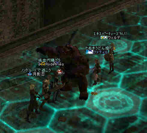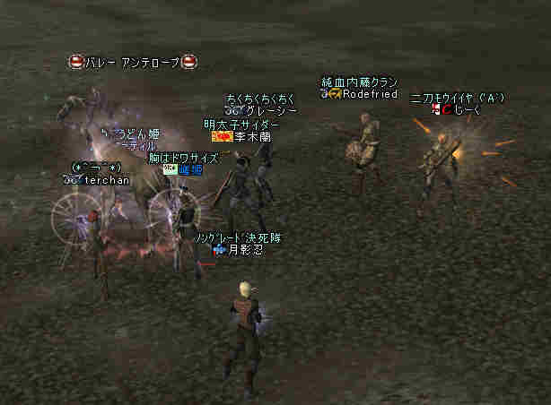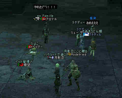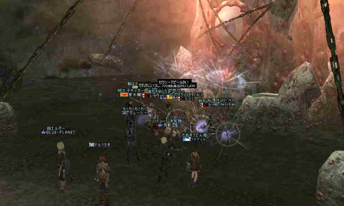 2006年7月13日(木) 21:00~22:30 ミッション:アルゴスの眼を探せ! 20:55頃、現地に到着。 すでに志願者が何名か集まっている。 特記すべきは一番乗りを名乗る志願者が2人。 「一番乗り」が「ふたり」って、「一番」の意味って一体なんだ@@; いや、ノングレード決死隊では、この「乗り」が大事だw 21:00過ぎに編成を開始…と言っても、1PT分の人数9人しか居ない。 普通なら、この状態で「みwwなww(中略)ぜww」で出発する所だが… 今回は、いつもと状況違う・・・ 参加希望者から連絡(Wis)が入るのだ… 「まだ間に合いますか?」とか「遅れます><;」とか… 社会人プレイヤーだと、 やはり通勤時間や残業等でどうしても遅くなりがちになる。 まして、緊急の仕事とか入った日には… 社会人は大変なのだ。 …と言うことは置いといて… 特筆すべき点はここにもある。 複数PTなんて、「ノングレードで逝こう!」始まって以来の快挙?@@;なのである。 主催を含む、古株メンバーで複数PTを体験したものは、いまだかつて居ない。 とりあえず、遅れて参加する志願兵がいる事をPT内に伝え、狩りを始める。 まずは、自分達の実力がどれくらいのものか? もちろん俺の目から見て真っ赤なMOBしか居ないw 「やってみなければ、わかるまい」 で、FAしてみる…当然タゲは俺に来るw さすがノングレード! 痛い!!(;´Д`) 3撃ぐらいで半分くらいHPが無くなっただろうか… ヒーラーが居てくれなければ、逝っていた…ありがとうヒール職のみんな(T-T;) また、後衛職も皆、いろいろな事を試す。 ルーツが結構決まる事が判明した! ルーツが決まると、狩りは格段に効率がアップする。 手探りで、色々な狩り方を模索するのも楽しさの一つだ。 確かにHPの削れるスピードは遅いが…相手の回復スピードよりも早い! なので、狩りが成立してしまうw スポも決まるw 1PTでも狩りは可能である。 ただし、ヒーラーは必須w さて、遅れてきたメンバーも徐々に集まってきたので入り口に一旦戻る。 再編成を行い2PTに。 「PTLやりたい人」 …シーン… 誰も居ないので、「ノングレードで逝こう!」皆勤賞の Rodefried 氏にお願いした。 さて、どうPTを分けようか…と、思案していると、 Rodefried 氏が看板をだした。 「逝くPTはこちら」(だったと思う) w みんなぞろぞろとそちらに… Rodefried 氏、両手どころか両足も花(ハーレム状態w) ww (おいおい、俺の方は@@;) 最終的には、バランスよく分かれた感じになったが…、 さすが死を恐れないノングレード勇者の集まりだw 心意気が違うぜw さて、PT分けだが、 PTLを立てて、その他のプレーヤーは、自分が選んだPTLの所に集まる。 自己責任で、自分のPTを決める。 ノングレード決死隊に相応しい方法だ。 なかなか使える方法だと思う。 そして、60を超えるMOBの中、ノングレード決死隊の冒険は続く・・・ 移動途中… 猛犬(スナッチ)も何とか倒したw 何か、とても硬かった気がするw 目玉のアクティブMOBに襲われ、魔法攻撃の直撃を受ける。 なんと8割くらいHPを持ってかれたw うはw 死むw 間違いなく死ぬw もう一撃受ければ逝っちまうw で、必死で逃げてたりする^^; ヒールしてもらってすかさず攻撃に参加w 戦死者がここで一人出たw ここは、予想通り(以上?)にとてもデンジャラスな場所だ…(;´Д`) リザ後、移動… そしていよいよ「アルゴスの眼」への坂道が見えてきたw 「この上だw」 みんな走って山頂へ… 「アルゴスの眼」発見w 誰も命令していないんだが… なぜかフルSS戦闘状態w(;´Д`) 現地到着:22:30 「ミッション終了!」 記念写真^^ 今回参加した、ノングレード勇者達の勇姿ですw みんな、ありがとう^^ そして… 恒例の5分帰還で幕を閉じた。 ミッション:アルゴスの眼を探せ! 完了!!