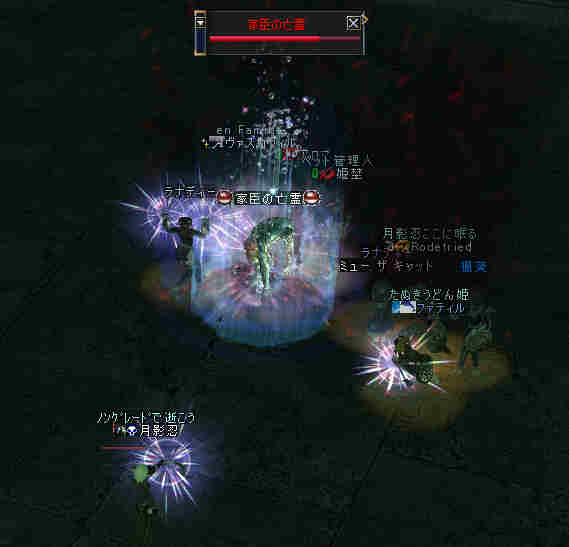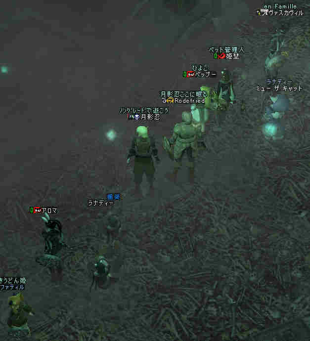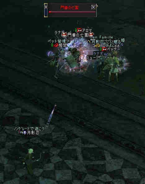 ノングレード決死隊の冒険「帝国の墓地編」 ミッション:「帝国の墓地を目指せ!」 準備:消耗品調達 アデン消耗品を購入し、持ち数を確認。 ・NSS:4,000個/@8a=32,000a ・祝NSPS:100個/@42a=4,200a ・体力POT:20個/@396a=7,920a ・木矢:2,045本/@2a=4,090a ================================ 合計:48,210a 開始アデナ:67,345a 移動: GK代「火炎の入り口」@1,400a 「アルゴスの壁」入り口到着 21:55頃 19;00から待っていたと言うRodefried 氏と合流。 Rodefried「だれも来なかったらどうしようかと…」 月影忍「主催やってて、それが一番恐い^^;」 さすがに今回のミッションは、2人は厳しいだろう^^; ふたりでPTを組んで、 白チャで話していると、ぽつりぽつりと参加希望者が集まる。 PTを組んでいるのだが、なぜかその後も白ちゃ会話が続く… 4人集まった所で、ちょいと試しにソロを… やはり、ノングレードでソロをした場合の危険性も身体を張って確認しておいた方が良いだろう… 「いてら~」とか言われて飛び出したのはいいが・・・ 「バレー アンテローブ」 入り口周辺に生息する鹿形モンスター。 LVは68でHP2倍モンスター。 当然俺とは10以上レベルが離れている。 この狩り場のレベルから言うとザコに違いない。 エンタングル(LV.7)発動…失敗 祝込めてw…失敗 効いたらラッキーとは思っていたが、予想通り決まらない。 月影忍「想定内だw」 弓もフルSSで連射w…時々外れw 月影忍「こ、これも想定内だw」無理にでも自分を落ち着けようとする… しかし、相手のダメージで、確実にHPは削られていく… 月影忍「うはw、だ…ダメだ、硬すぎる」 月影忍「やばい、やばい、やばい、やばい、やば…」 脳内警報音が激しく鳴り響くw こちらが相手のHPを1/5ほど削った時に、こちらはすでに瀕死の状態に…(;´Д`) 前回もFAで痛さは実感していたが、 PM「これは、逝ったな…」 モニターの向こうのPM(プレイマスター)がポツリと言った… 月影忍「こ、こらw」 さすがの俺も動揺を隠せないw PM「想定内だ…」 月影忍「勝手に想定内にすなw!」 PM「ノングレードで逝ってみよう!」 月影忍「まだ、イベント始まってねーよw(;´Д`) 」 俺は「身体を張って確認」とか言わなきゃ良かったと少し後悔T-T 参加者は、裏で行われていたこの壮絶(?)な、やり取りを知る由も無い。 そして、その参加者にヒールしてもらえなかったら、俺は確実に逝っていた。 何度もヒールしてもらって、やっと倒す事が出来たが… PM「ち、生き残ったか…」 月影忍「…」 ソロは無理の狩り場だなw 遅れて何名か来ると言う話なので、集まったメンバーと狩りをする事に。 入り口近くに、業者だか、肉入りBOTだか、忙しなく動き回っている。 そして、たまに同じ標的を・・・ 今回は、火力で負けた(;´Д`) (ドロップもスポも向こうに優先権がw FAしたのこっちなのにw) BOT恐るべし・・・じゃなくて、消えて欲しいぜ、まったく。 傍から見て、どう考えても楽しんでいる様には見えない機械的な動き。 見ていて気持ち悪いと感じるのは俺だけじゃないだろう。 さて、ソロで困難だった狩りも、PTになるとだいぶ楽だ。 各々のスキルを駆使しないとPTでの狩りですら、結構危険な状態になる。 ルーツかける人、ヘイトする人、スポる人、殴る人、ヒールや状態異常を治療する人。 連携が大事。 遅れてきた人が到着したので入り口に戻り、合流。 さて、「ミッション開始」である。 ・バレーバンダースナッチ(レベル70、3倍HP) ・バレーバンダースナッチスレーブ(レベル71、3倍) ・バッファロースレーブ(レベル72、3倍HP) これを書くに当たって、モンスターのレベル調べてるのだが・・・ ここって、こんなに高レベルの狩り場だったのかw @@; (マテ 倒せてはいるんだが・・・かなり危険なレベルだw と言うか、無謀? ふ・・・ノングレード決死隊にふさわしいぜw そして・・・ ダメージも半端ではないw ・グレイブ スカラベ(レベル72) (;´Д`) ・スカベンジャー アント(レベル74) 硬さも半端ではない。 ほとんど半分レイドボスと化した高レベルモンスター達! 武器も装備も上限は決まっている装備。 ノングレードの武器でレベル20近くも離れたモンスターと戦っている。 特筆すべきは、全滅しないで、普通に狩りが出来ている事だろう。 ここは、適正レベルの装備でも危ない場所だ・・・。 と言うか、普通は50代で来れる場所では無いだろう。 今回のPT参加者では、最高レベル63だ。 それにしても10以上レベルが高いモンスターと戦っている事になる。 そして俺たちはやってきた! 「帝国の墓地」 記念写真・・・ Rodefriedさん、そのタイトルってwちょw@_@w ミッション:「帝国の墓地を目指せ!」 完了 今回のノングレード勇者達(敬称略) ヴァスカヴィル/姫埜/ペップー/Rodefried/楓葵/ラナディー/アロマ/ファティル 今回の危険極まりないミッションへ参加した猛者達である。 で、足元を見ると、すごい事になってる。 wっうえwっうえっうぇwww 俺の骨もあるのか!? ミッションは終了したが・・・ せっかくここまできたんだから・・・ いける所まで・