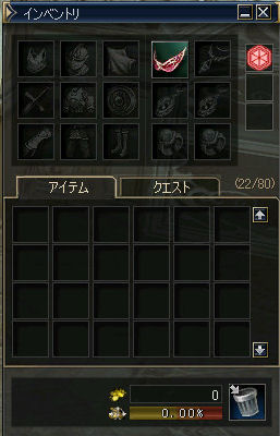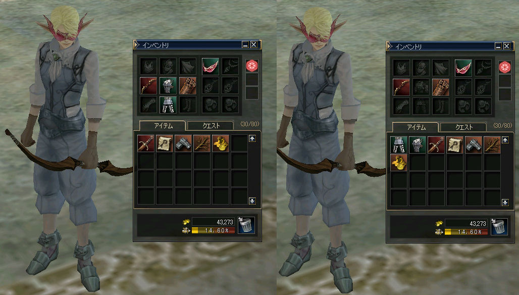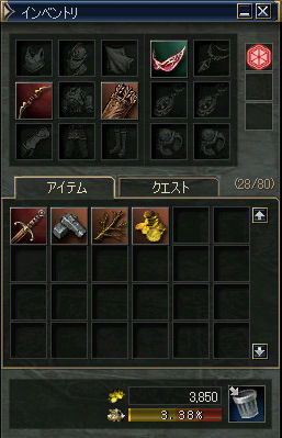 初期ステータス:攻撃力10(;´Д`) 右のダブルクロスで勝負だw んで、キノコクエの最初の報酬でボーンタガーを購入した。 攻撃力が33まで上昇した。 狩りがだいぶ楽になる。 防具はと言うと、 低レベルのMOBの攻撃なんてどうせ回避できて、俺には当たらないだろうからパスw。 キノコクエを繰り返す…スポアファングスLV9のMOBだ。こちらからみると当然真っ青。 「アデナもほとんど落ちることは無い」と言うのが定説かなと思うのだが… これが、意外と時々ドロップする。試してみるもんだねぇ…発見です。 今日の戦果: ボーンタガー(883a)、ボウ(14,735a)、現金3850a、ドロップした素材少々 弓装備時の攻撃力387(自己バフあり) (´ー`)ノ 果たして一ヶ月でどれくらいまで装備を整えられるだろうか… 以下次号!